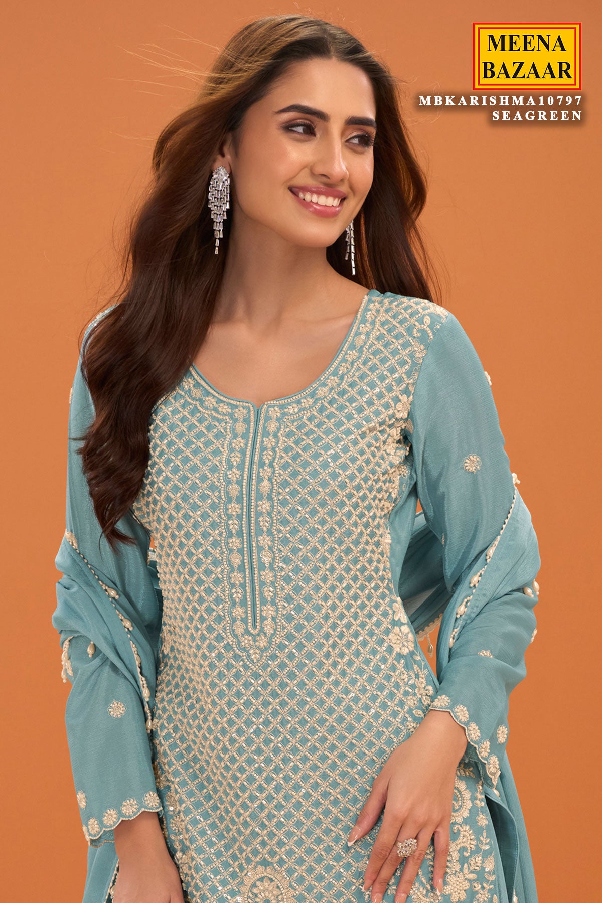 Sea Green Chinon Embroidered Ready Made Suit - Elegant Festive Wear