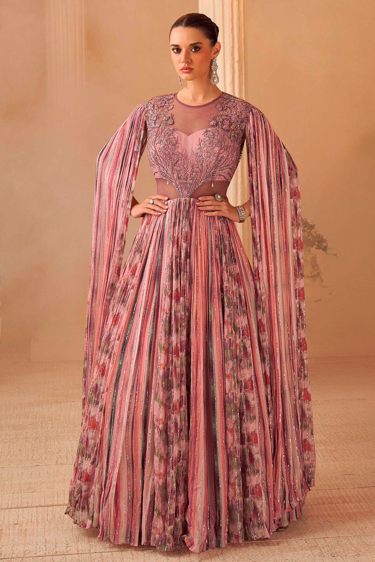 Pink Embroidered Designer Gown with Pleated Cape