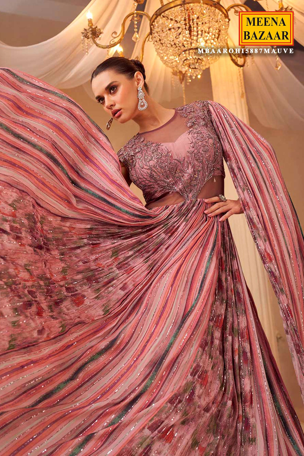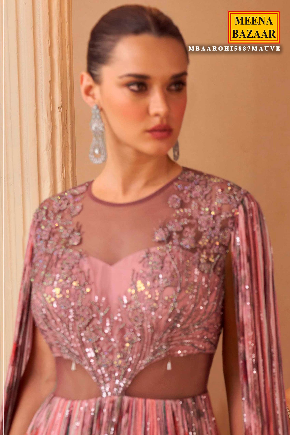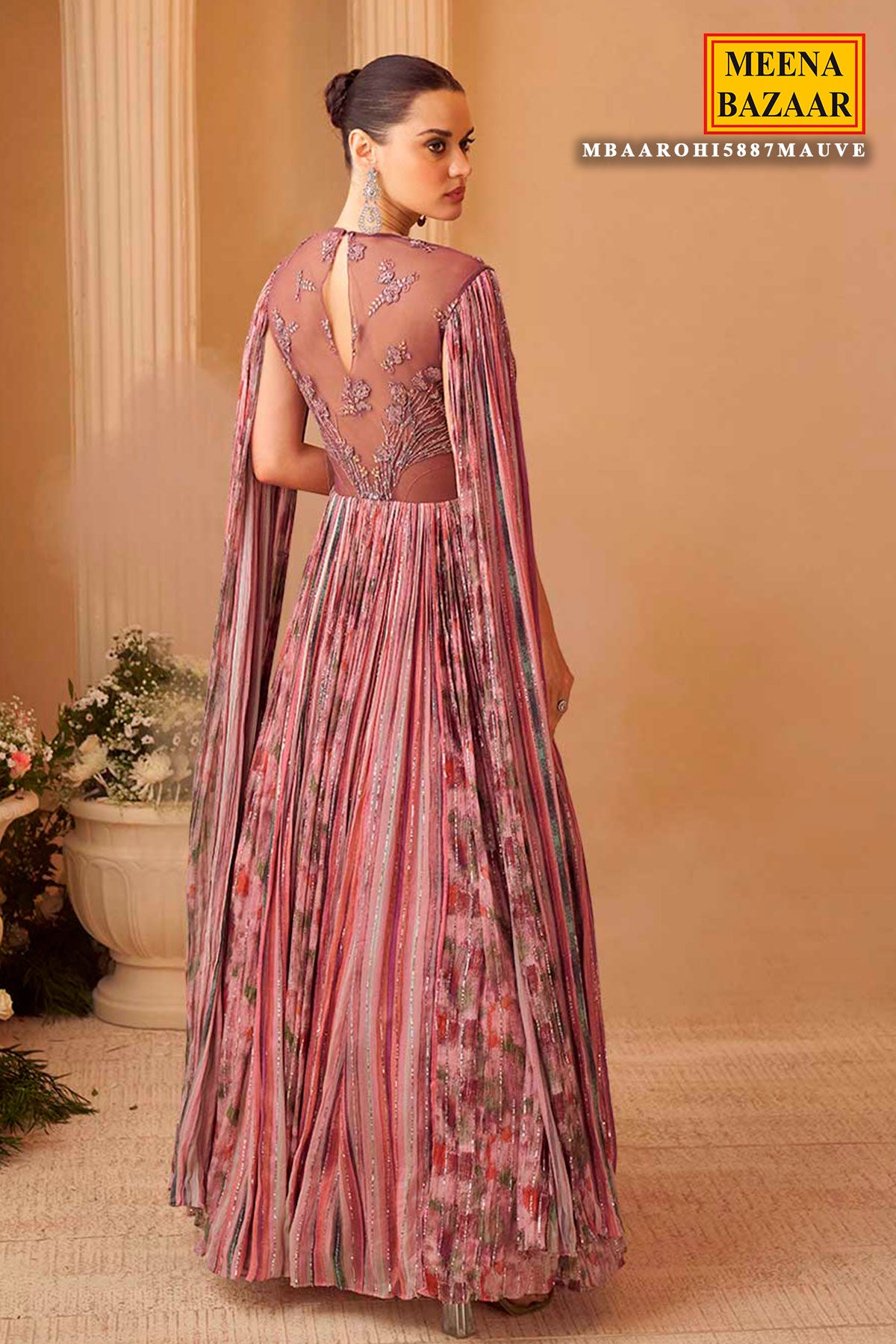 The style with this exquisite pink designer gown from Meena Bazaar. This elegant floor-length gown features a unique pleated fabric with shimmer detailing, beautifully complemented by a sheer embroidered bodice and attached cape sleeves. The delicate floral embroidery and soft PIink hue bring a perfect blend of sophistication and grace. Ideal for weddings, receptions, or festive parties, this designer Pink gown offers an effortlessly regal look. Pair it with statement earrings and heels for a glamorous evening ensemble.