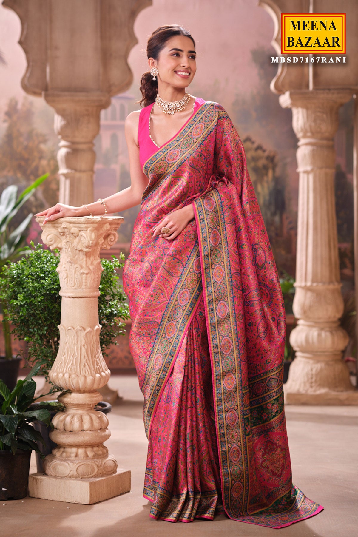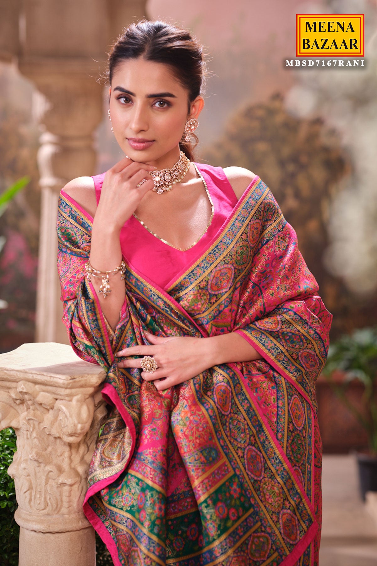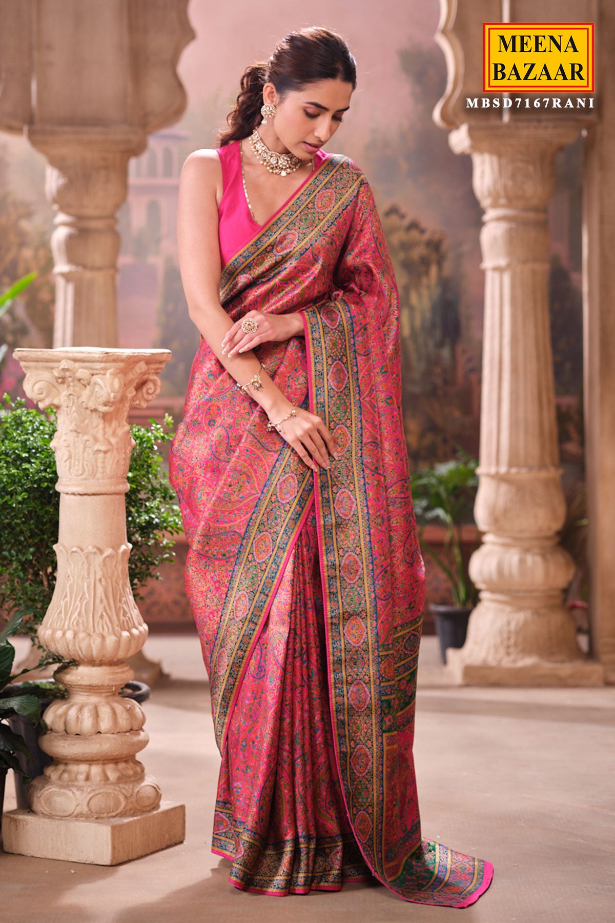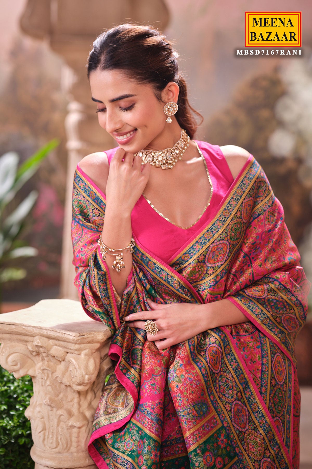 This is a Rani Silk Weaving Saree from Meena Bazaar. Crafted from premium silk, this saree features intricate traditional weaving that enhances its luxurious appeal. The rich rani shade adds warmth and sophistication, making it an ideal choice for festive events, family functions, poojas, and wedding celebrations. Soft, smooth, and easy to drape, this saree ensures both comfort and style. Its classic woven detailing gives it a heritage charm that suits all age groups.