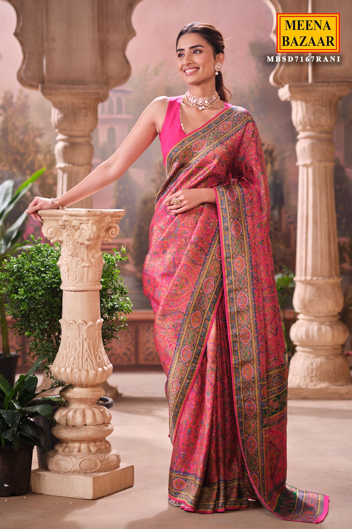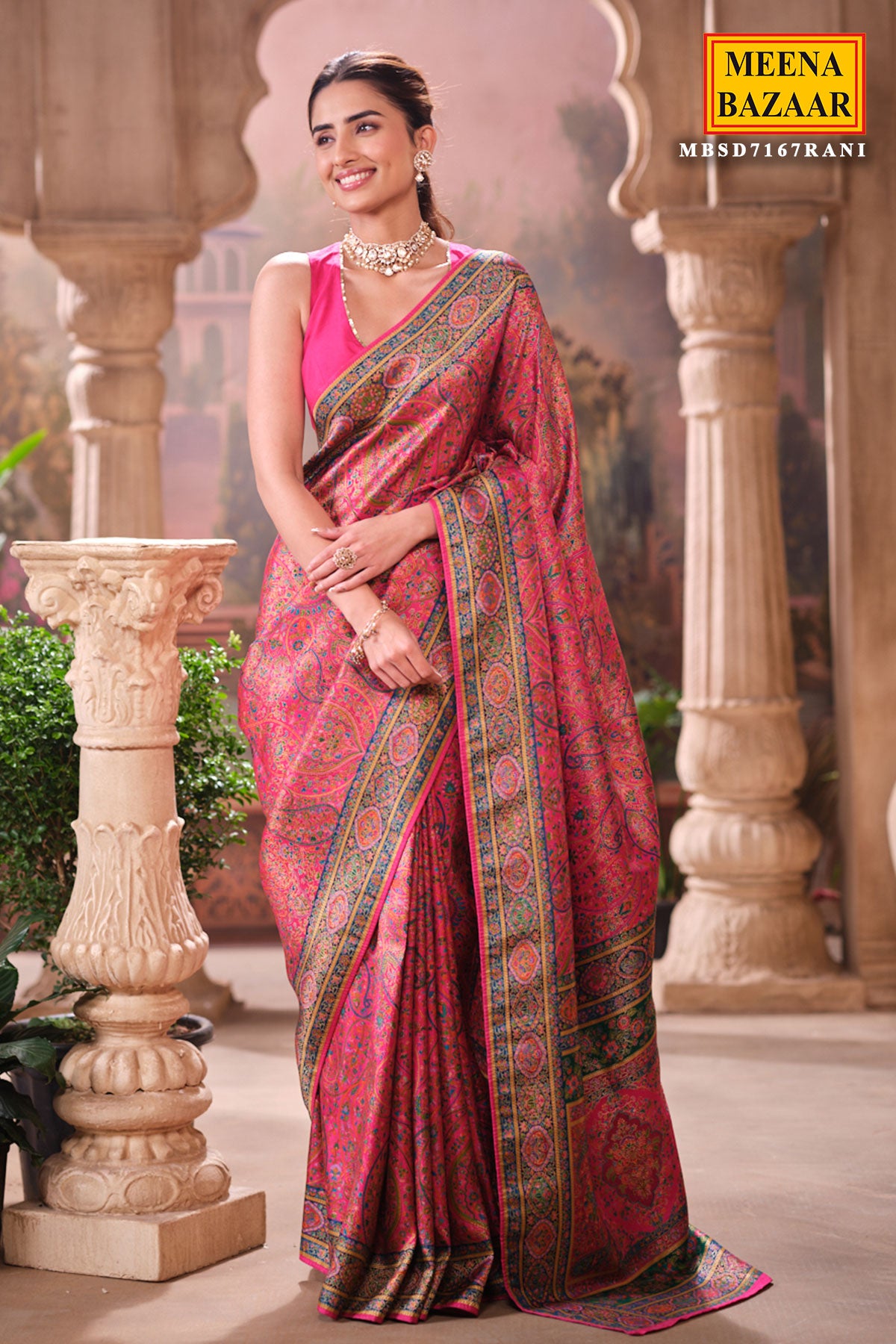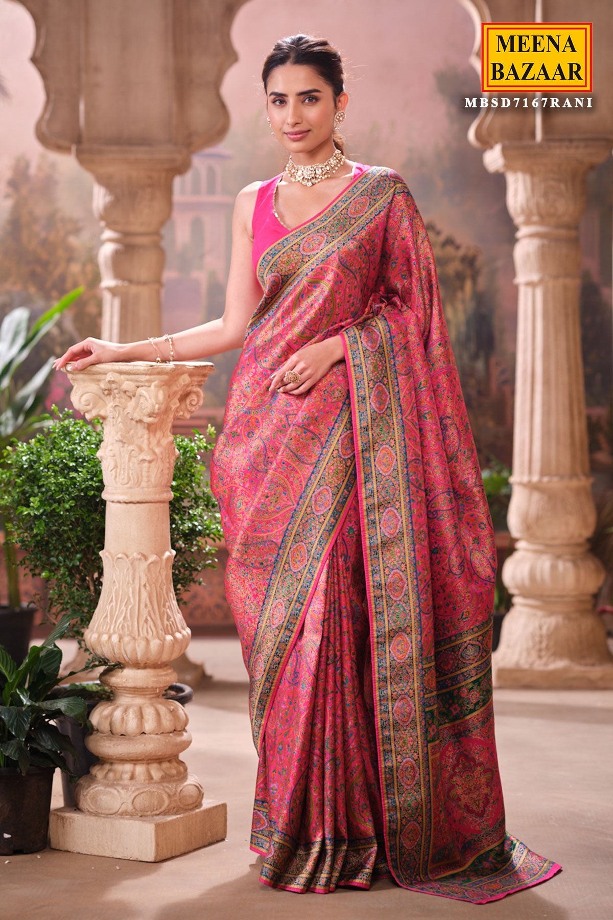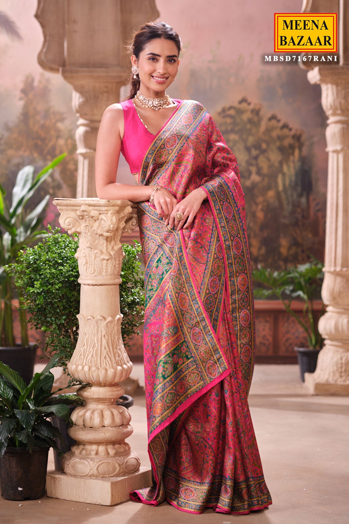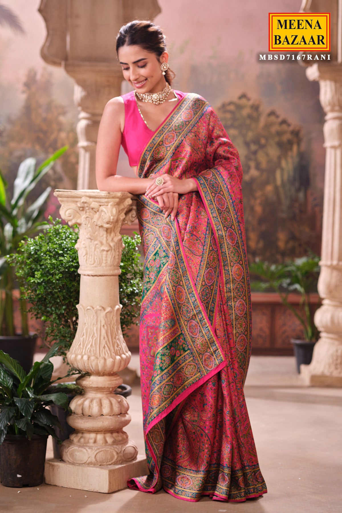 This is a Rani Silk Weaving Saree from Meena Bazaar. Crafted from premium silk, this saree features intricate traditional weaving that enhances its luxurious appeal. The rich rani shade adds warmth and sophistication, making it an ideal choice for festive events, family functions, poojas, and wedding celebrations. Soft, smooth, and easy to drape, this saree ensures both comfort and style. Its classic woven detailing gives it a heritage charm that suits all age groups.