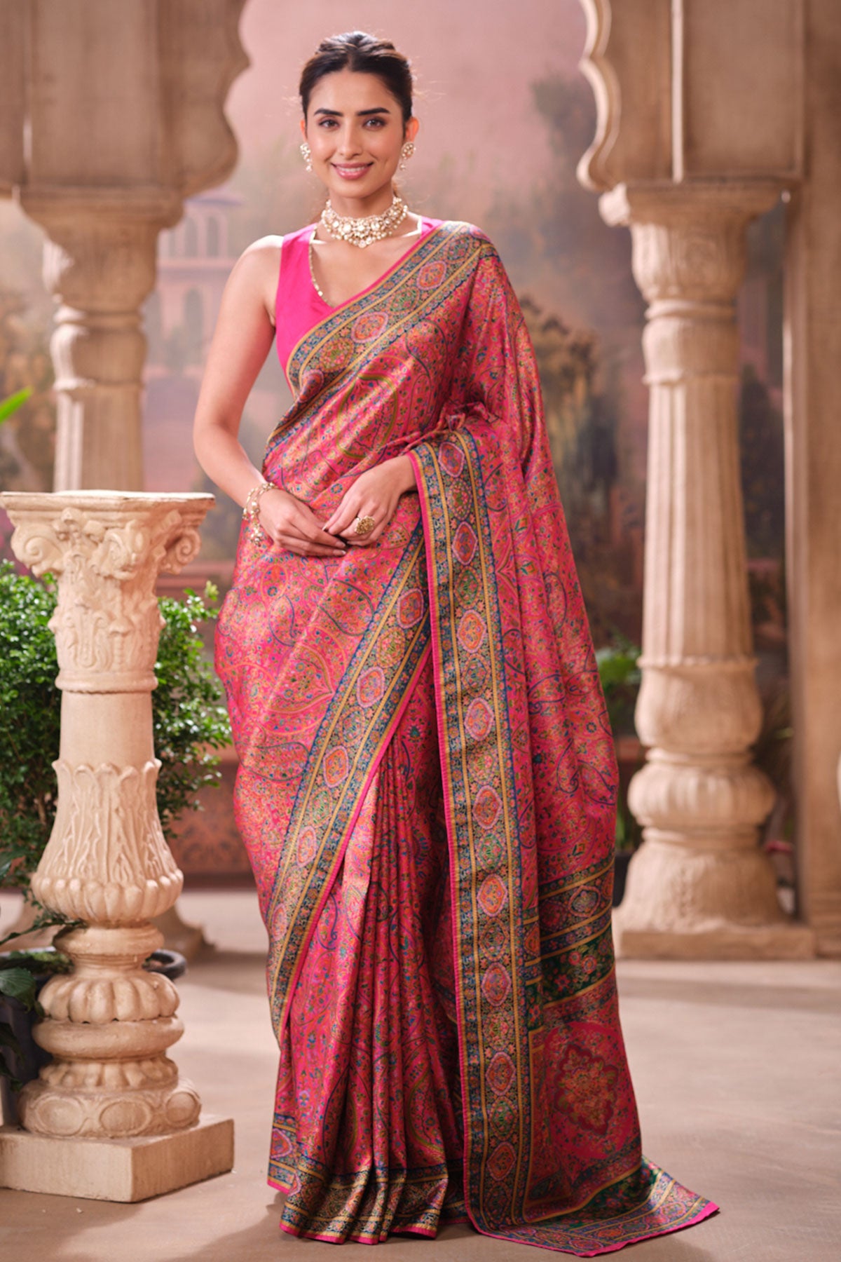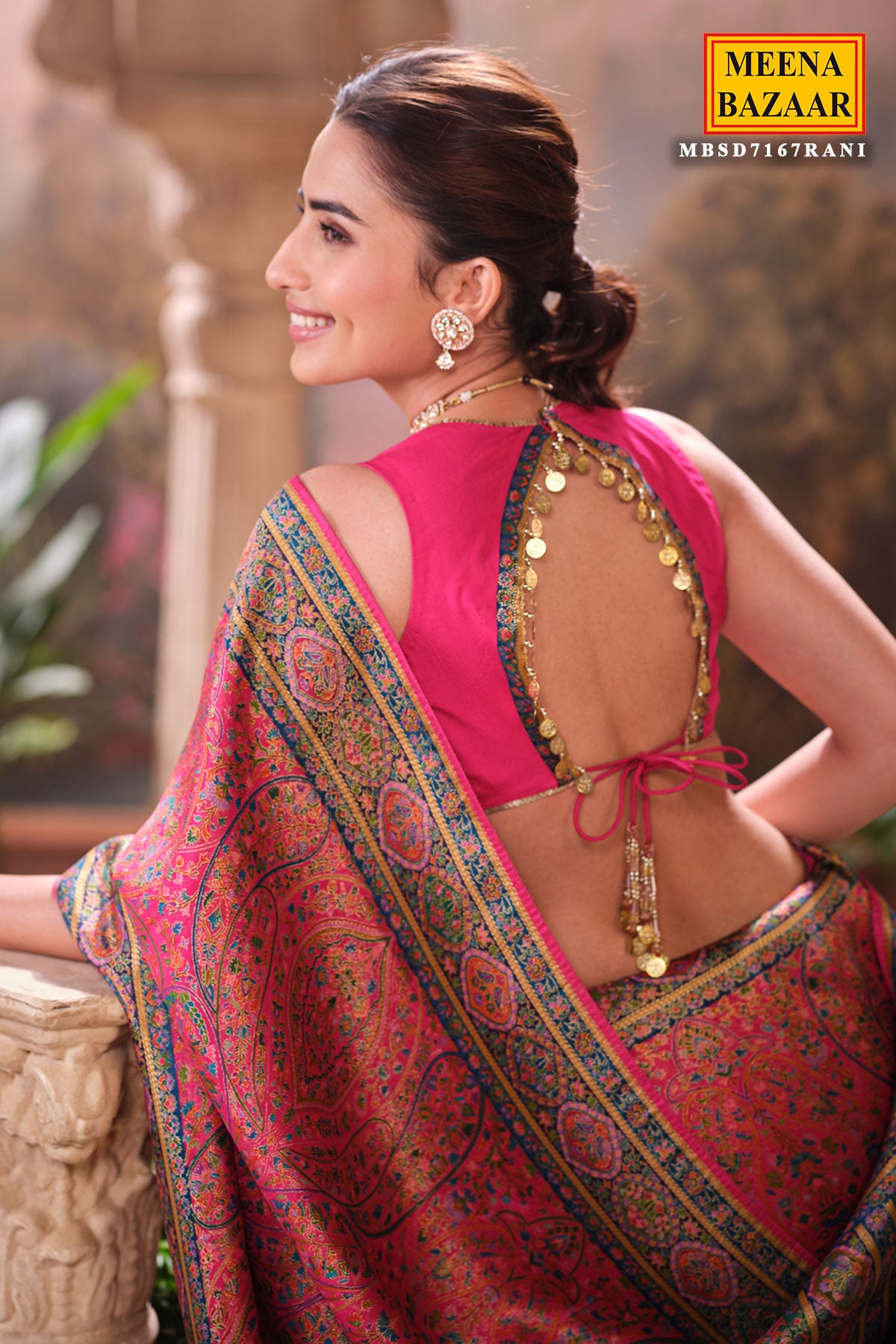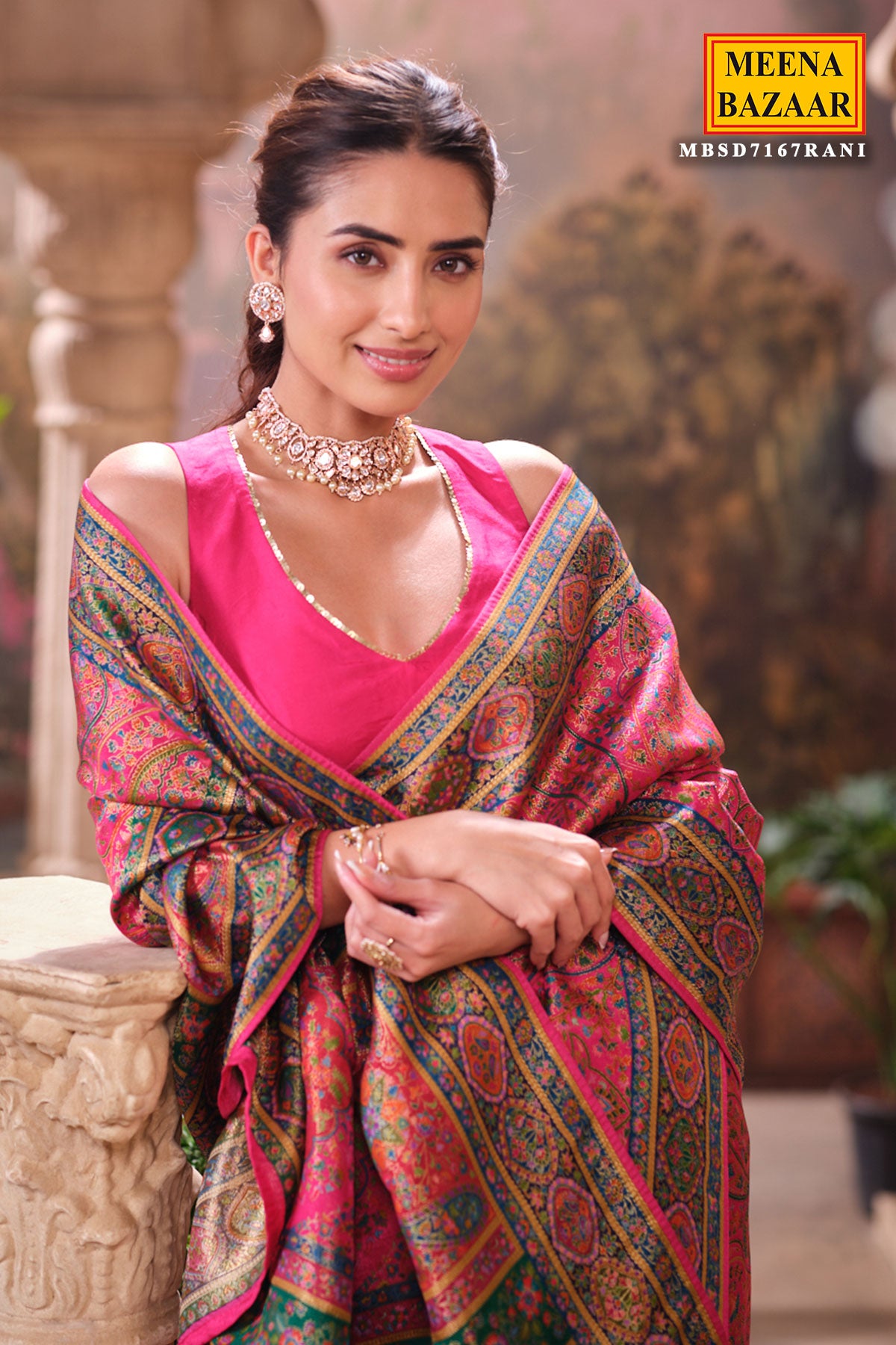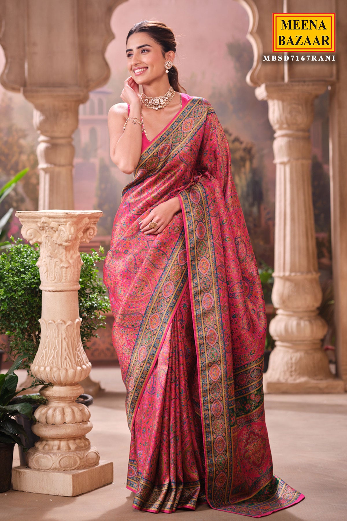 This is a Rani Silk Weaving Saree from Meena Bazaar. Crafted from premium silk, this saree features intricate traditional weaving that enhances its luxurious appeal. The rich rani shade adds warmth and sophistication, making it an ideal choice for festive events, family functions, poojas, and wedding celebrations. Soft, smooth, and easy to drape, this saree ensures both comfort and style. Its classic woven detailing gives it a heritage charm that suits all age groups.