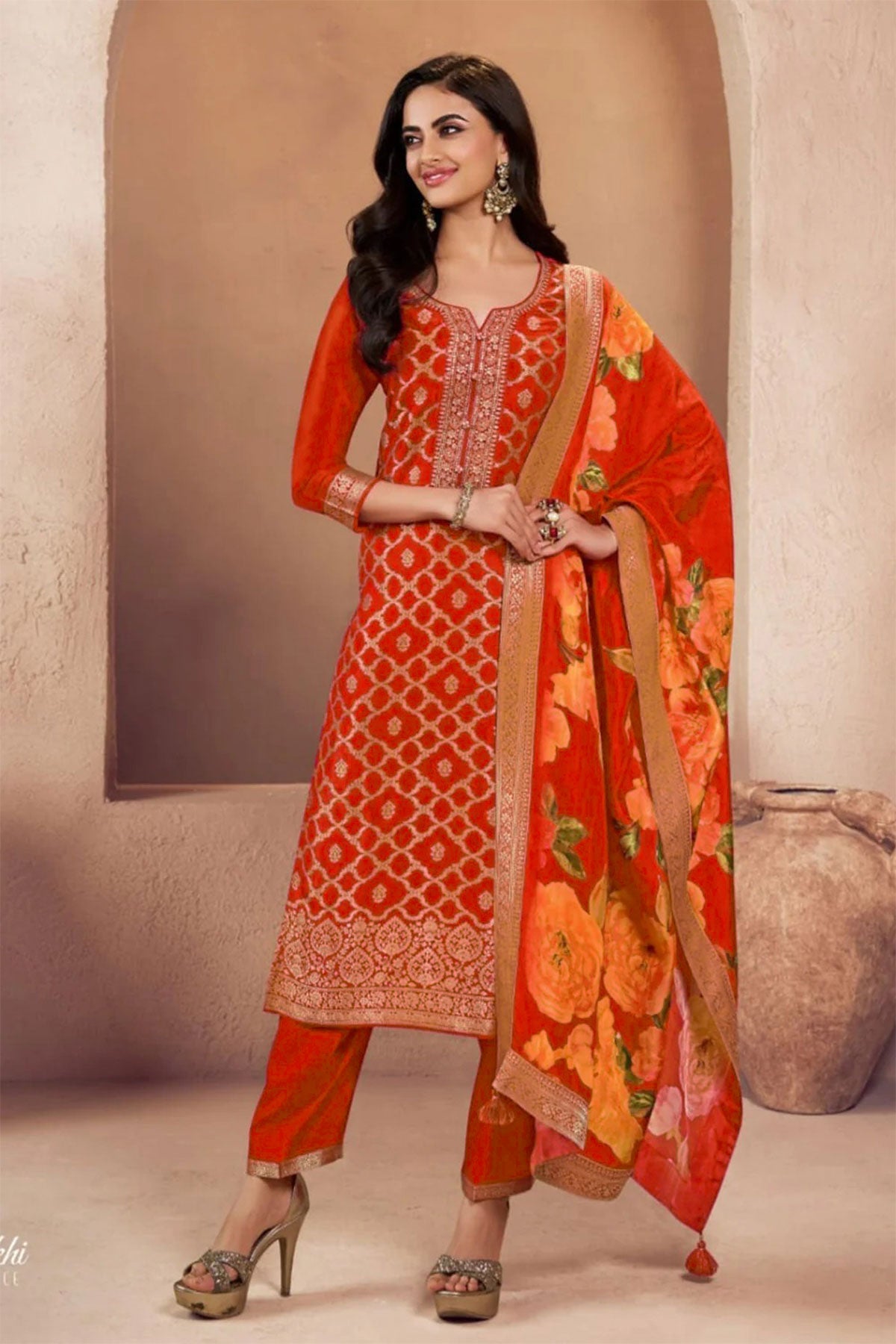 Brighten up any festive occasion with this stunning orange silk ready-made suit, designed to offer a perfect blend of elegance and tradition. The premium silk fabric gives a rich, lustrous appeal, while the intricately crafted neck embroidery adds a refined touch to the overall look. Ideal for celebrations, cultural events, and family gatherings, this suit set ensures comfort with a sophisticated finish. Style it with subtle jewellery for a graceful, festive-ready ensemble.