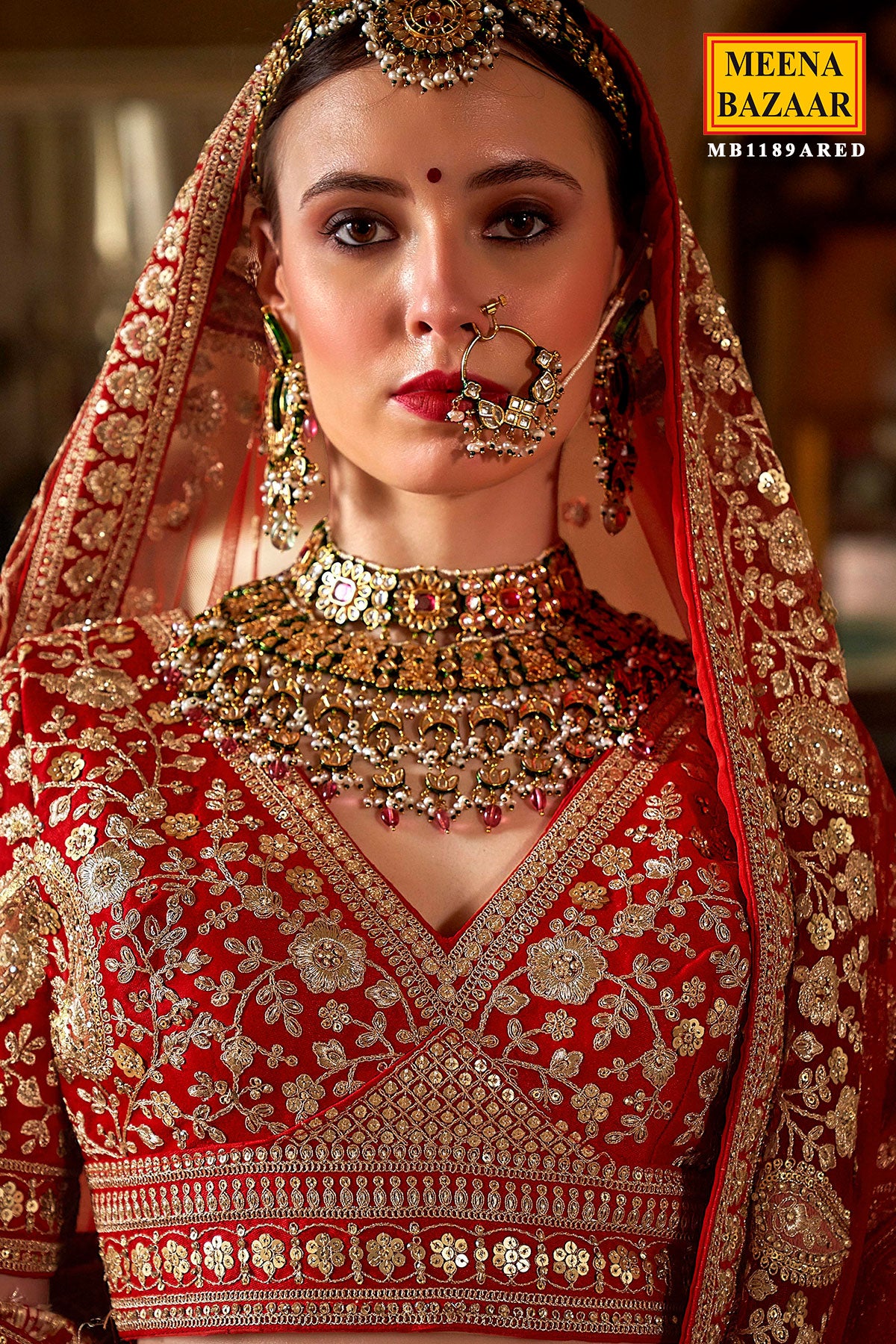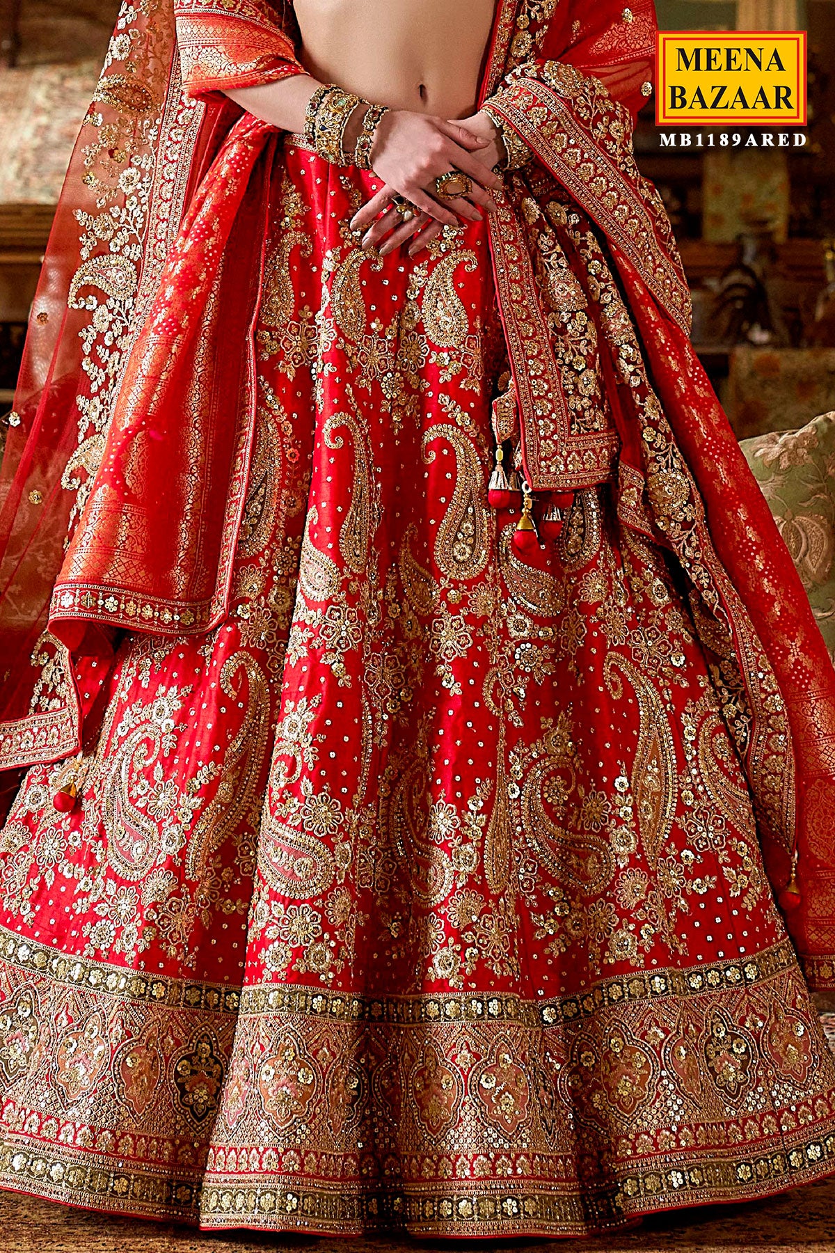 Make a grand entrance with this Red Silk Zari and Sequin Embroidered Lehenga from Meena Bazaar, a perfect reflection of elegance and tradition. The luxurious silk fabric lends a smooth, lustrous finish, while the intricate zari and sequin embroidery adds a radiant touch of glamour. The vibrant red hue embodies love, confidence, and celebration — ideal for brides, festive occasions, and weddings.