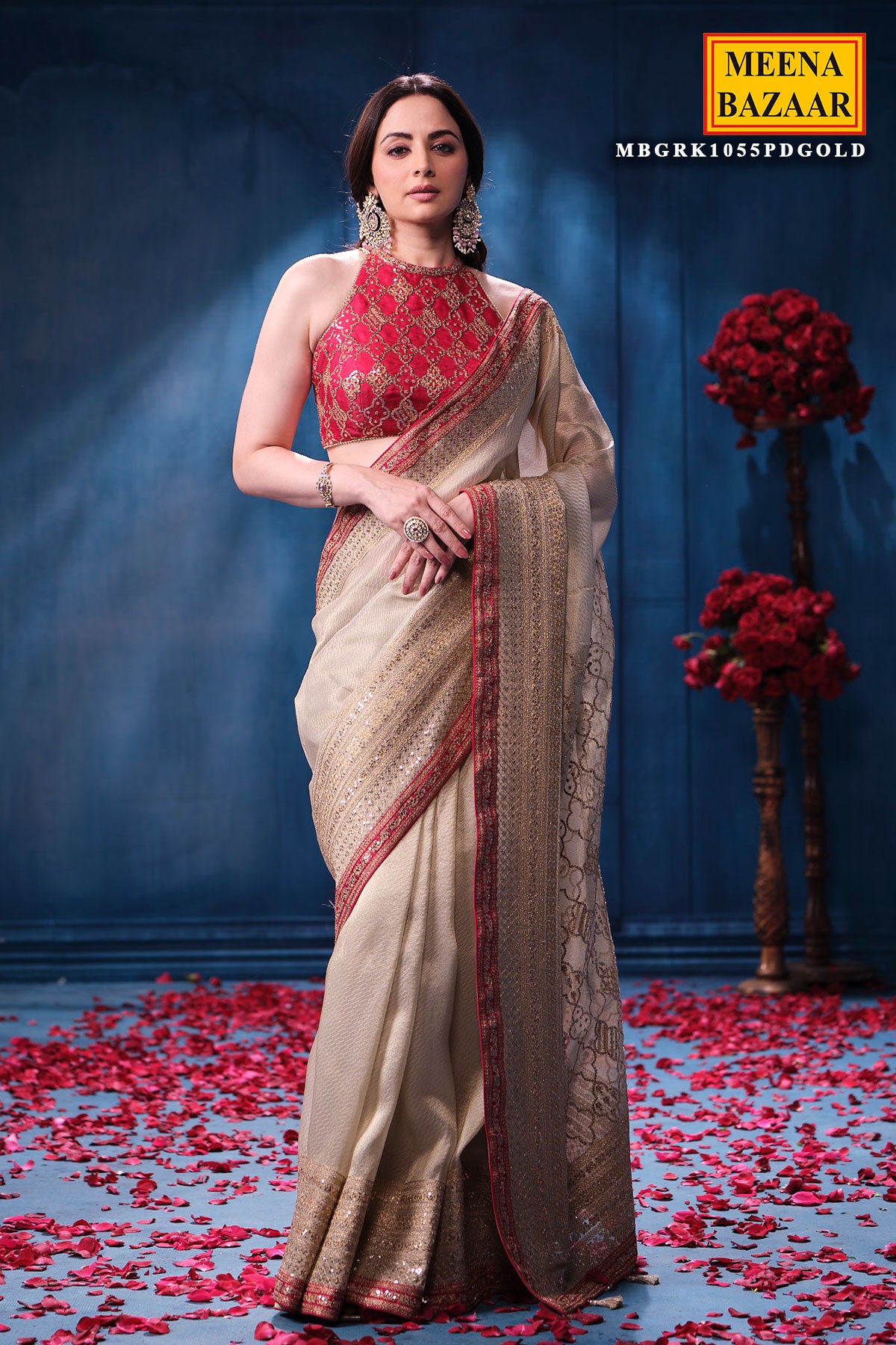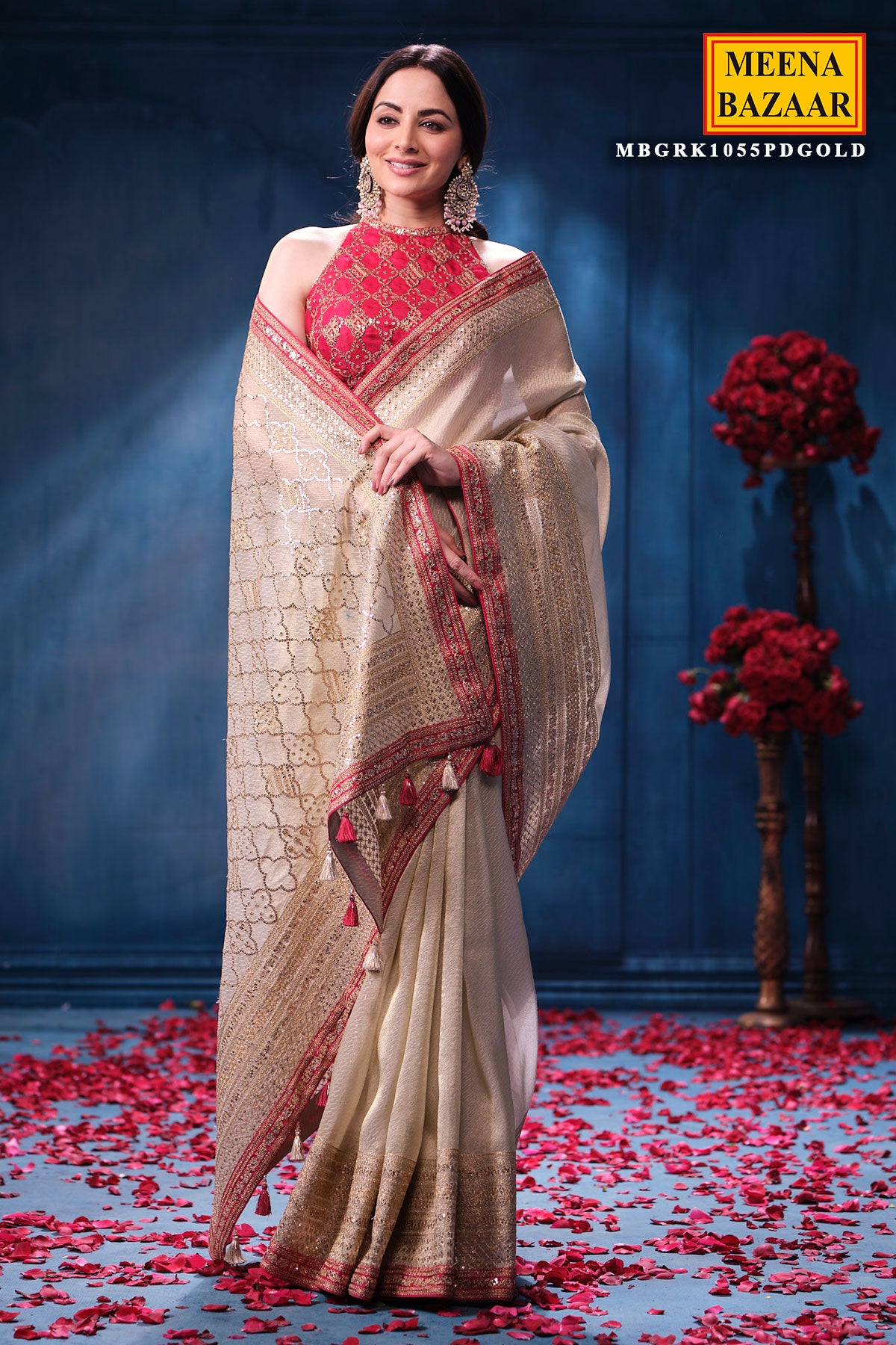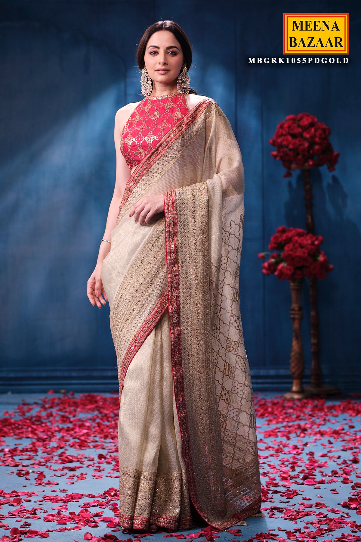 This is a Gold & Rani Tissue Saree from Meena Bazaar. Crafted from premium tissue fabric, this saree features a delicate sheen that enhances its rich and graceful appeal. The beautiful blend of gold and rani hues creates a regal contrast, making it a perfect choice for weddings, festive celebrations, receptions, poojas, and grand occasions. Lightweight and airy, the tissue fabric drapes effortlessly, offering both comfort and sophistication. This designer tissue saree comes with matching unstitched blouse fabric, allowing you to customise your blouse style. Pair it with traditional jewellery to complete a timeless and elegant ethnic look.