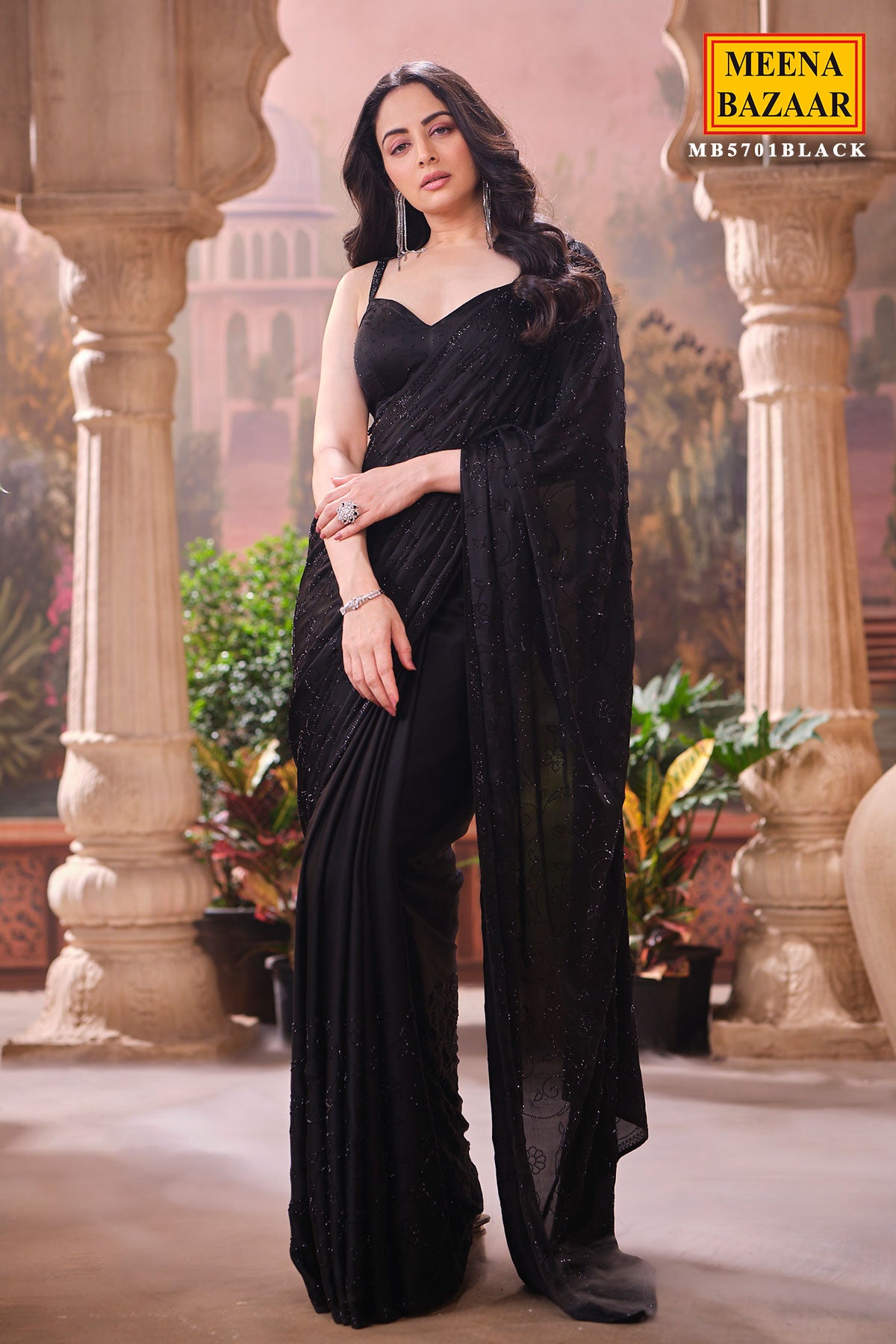 This is a Black Satin Embroidered Saree from Meena Bazaar. Crafted from luxurious satin fabric, this saree features delicate embroidery work that adds a refined touch of glamour and sophistication. The rich black shade exudes timeless charm, making it an ideal choice for evening parties, cocktail events, festive celebrations, receptions, and special occasions. Smooth, soft, and fluid, the satin fabric drapes beautifully, offering both comfort and a graceful silhouette. This designer embroidered saree comes with matching unstitched blouse fabric, giving you the freedom to customise your blouse style. Pair it with statement jewellery and heels for a classy, modern ethnic look.