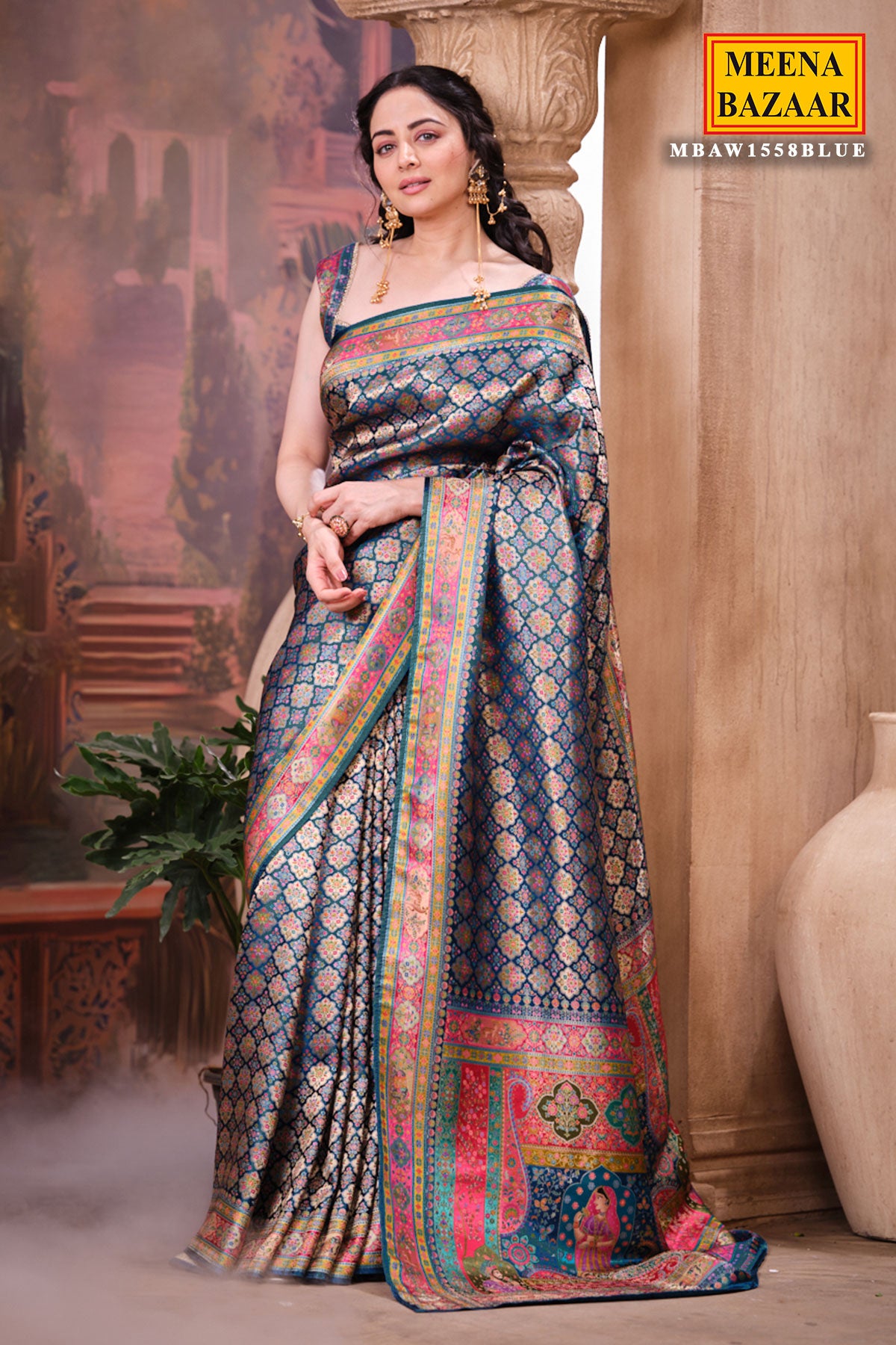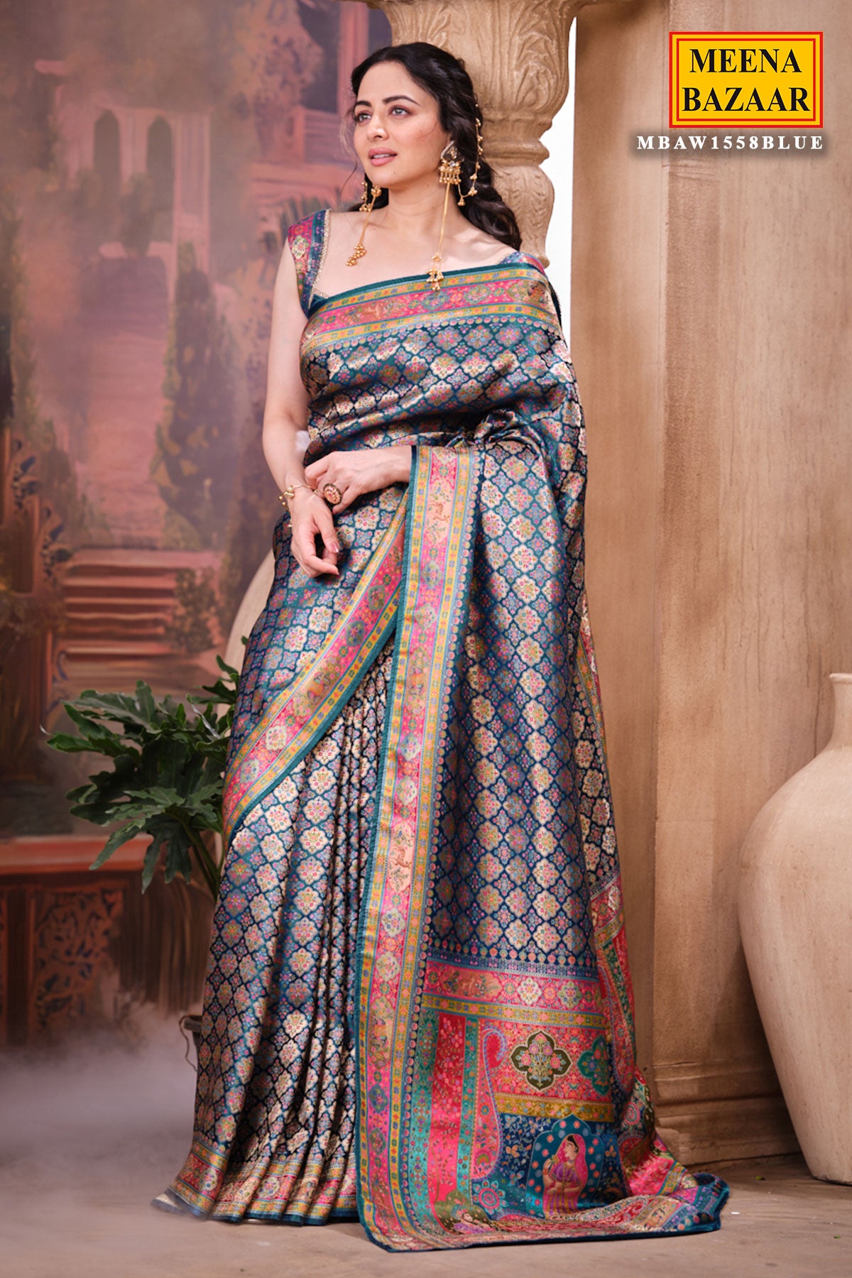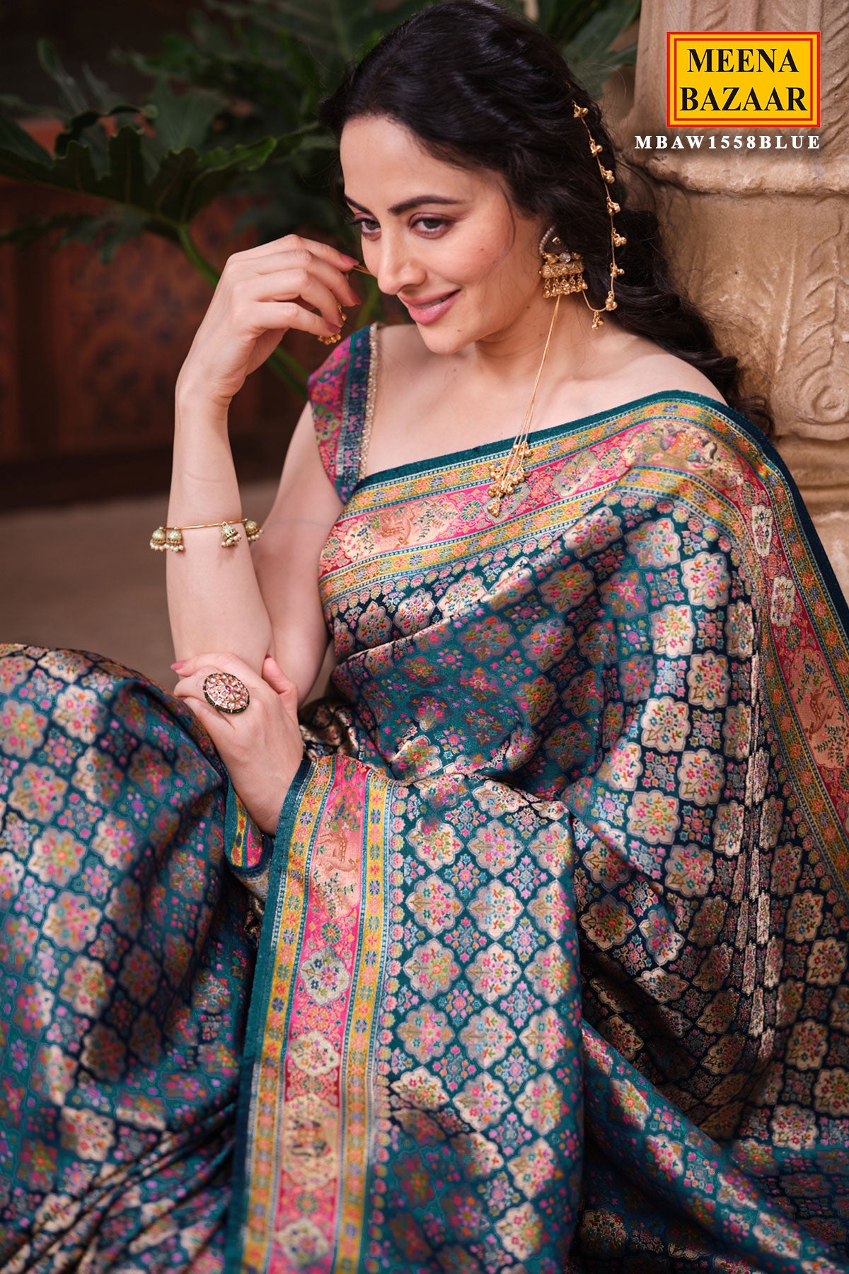 This is a Dark Turquoise Blue Silk Weaving Saree from Meena Bazaar. Crafted from premium silk fabric, this saree features intricate weaving work that adds depth, richness, and timeless charm. The deep dark turquoise blue shade offers a regal yet contemporary appeal, making it an excellent choice for weddings, festive celebrations, poojas, receptions, and special occasions. Soft, lightweight, and luxurious, this silk weaving saree drapes effortlessly, ensuring comfort along with graceful movement. It comes with matching unstitched blouse fabric, giving you the freedom to customise your blouse style. Pair it with traditional jewellery to complete a refined and elegant ethnic look.