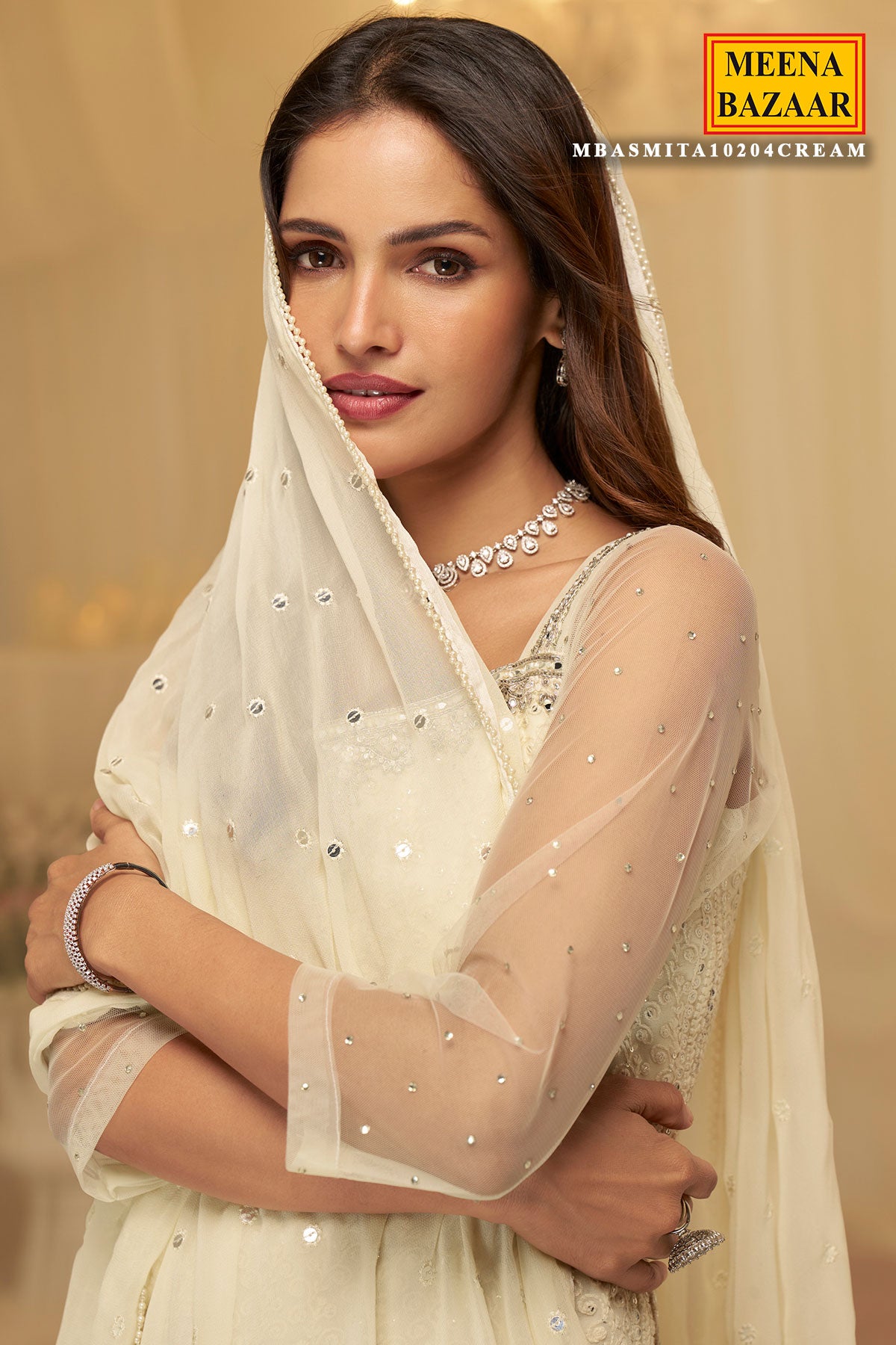 Embrace timeless elegance with this beautifully designed Anarkali ready made suit crafted in soft and flowy georgette fabric. The graceful cream color adds a touch of sophistication and charm, making it a perfect choice for festive gatherings, traditional celebrations, and special occasions.
