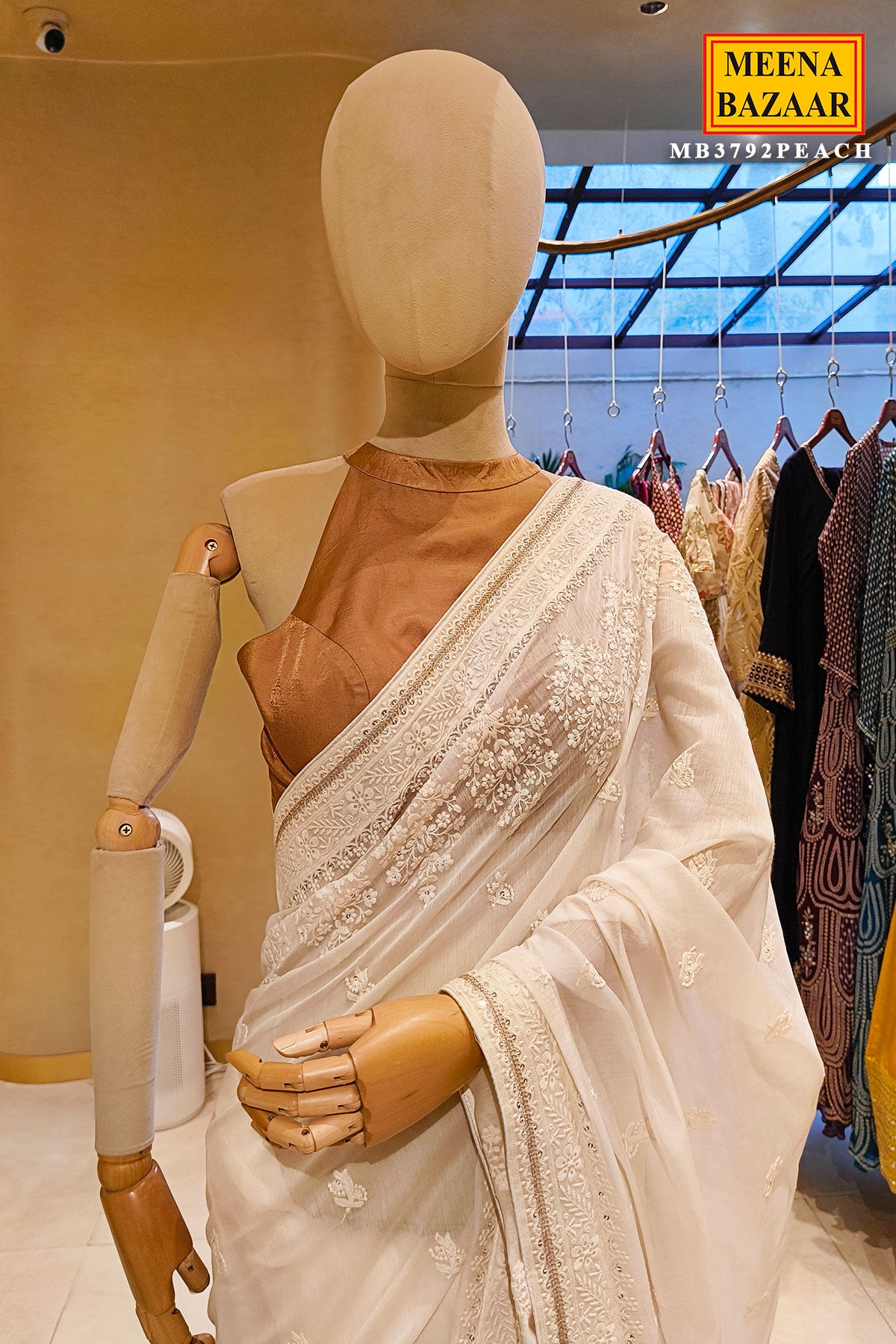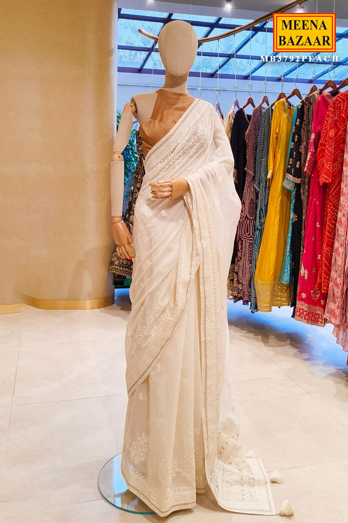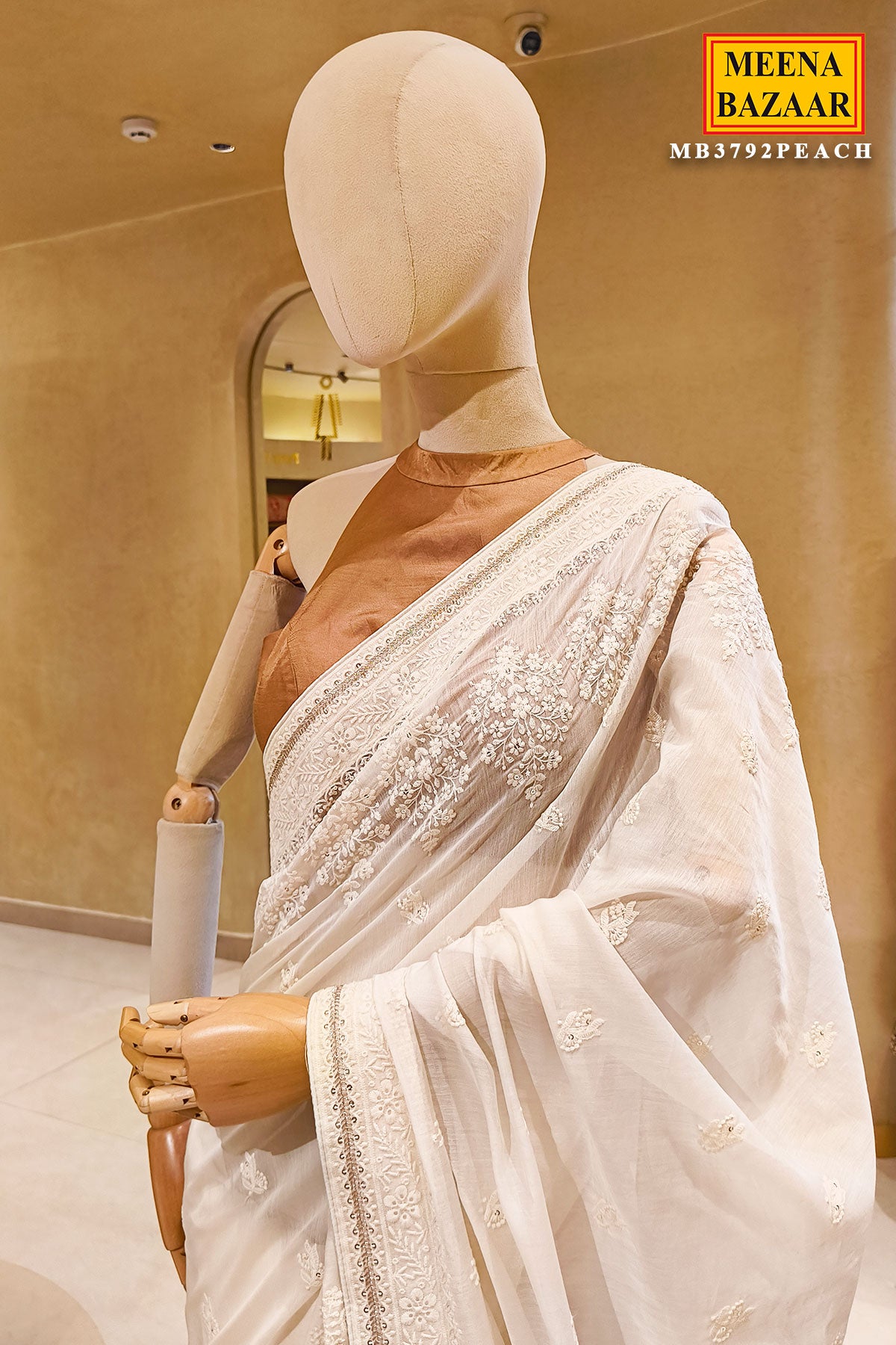 The lightweight fabric ensures a flawless drape, allowing the saree to fall beautifully and move effortlessly with every step. Its soothing ivory hue adds a touch of purity and sophistication, making it ideal for day functions, poojas, engagement ceremonies, or elegant festive gatherings.