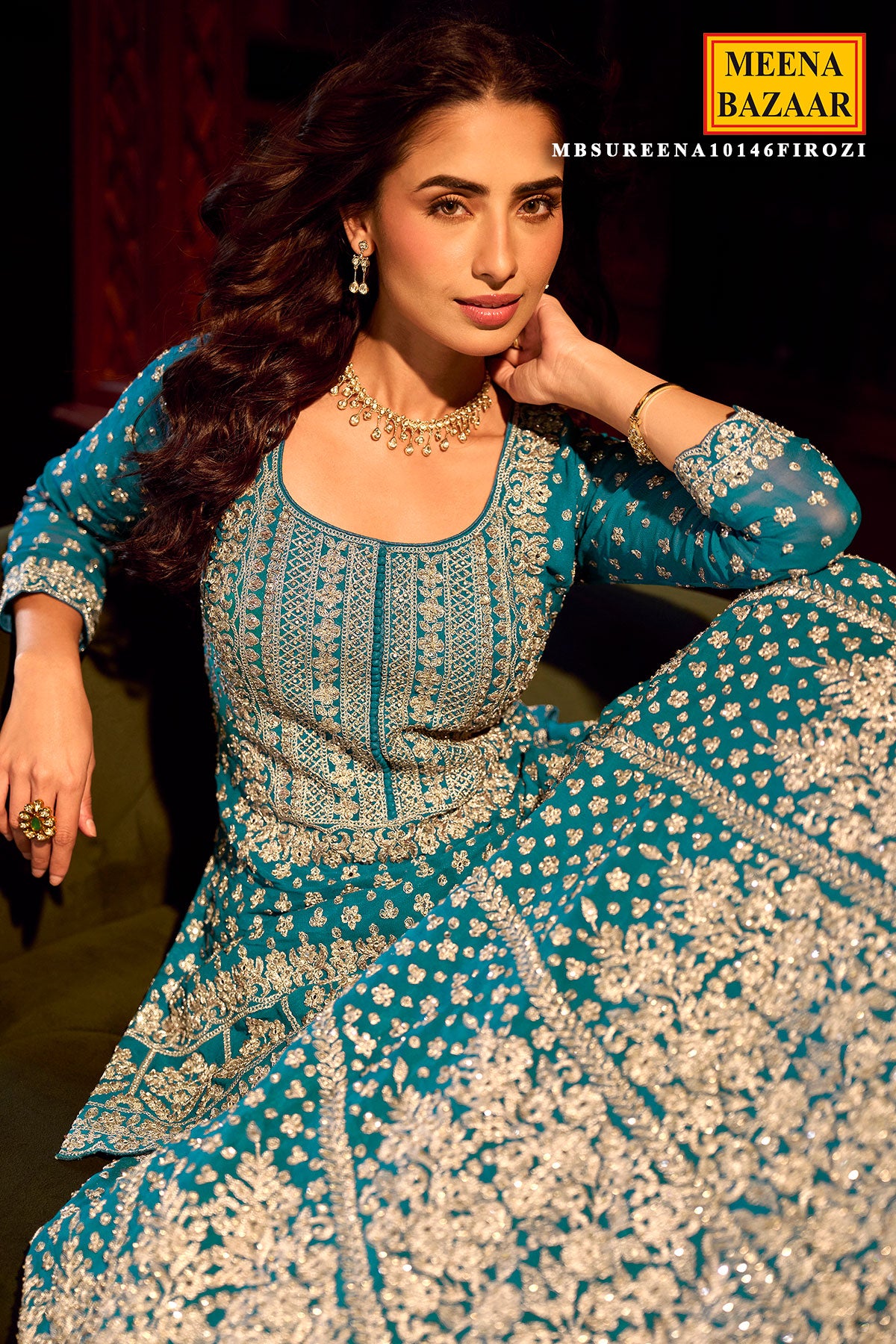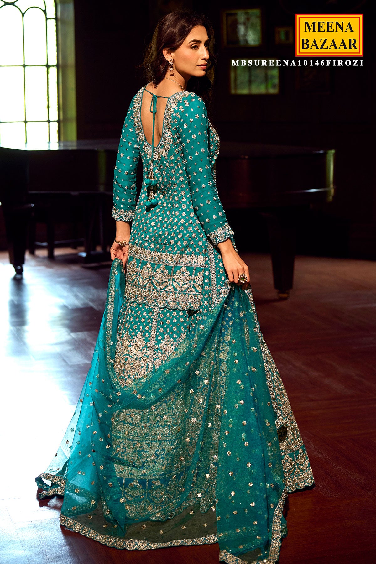 Refresh your festive wardrobe with this Firozi-colored ready-made suit, crafted in lightweight and graceful georgette fabric. Enhanced with delicate embroidery, the ensemble reflects refined craftsmanship and timeless ethnic appeal. The soothing firozi hue combined with a fluid drape creates an elegant silhouette, perfect for weddings, festive gatherings, and special occasions. Style it with minimal jewelry and heels for a polished and sophisticated look.