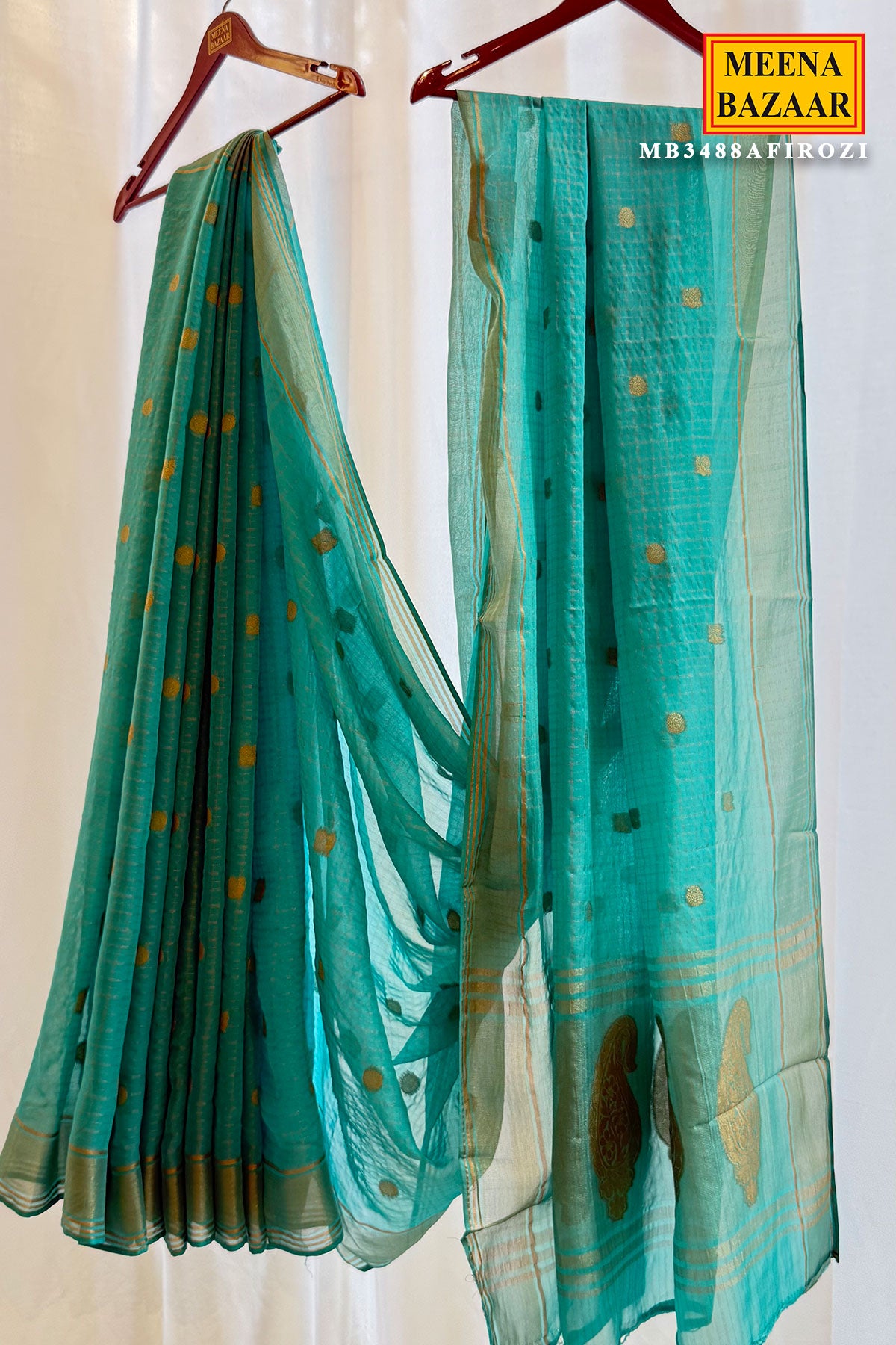 This elegant firozi Banarasi silk saree radiates timeless sophistication and regal charm, making it a perfect choice for festive occasions and graceful evening celebrations. Crafted from a rich, lustrous silk fabric, the saree features a serene firozi base adorned with delicate gold zari buti motifs that create a refined and luxurious appeal. The subtle sheen of the fabric beautifully enhances the intricate craftsmanship, while the finely woven zari border adds depth and traditional richness to the overall look.