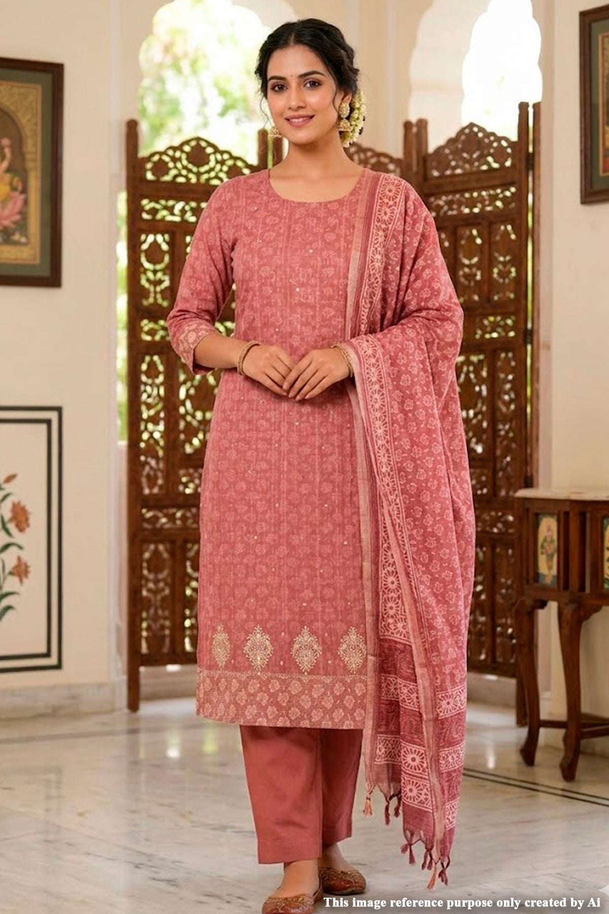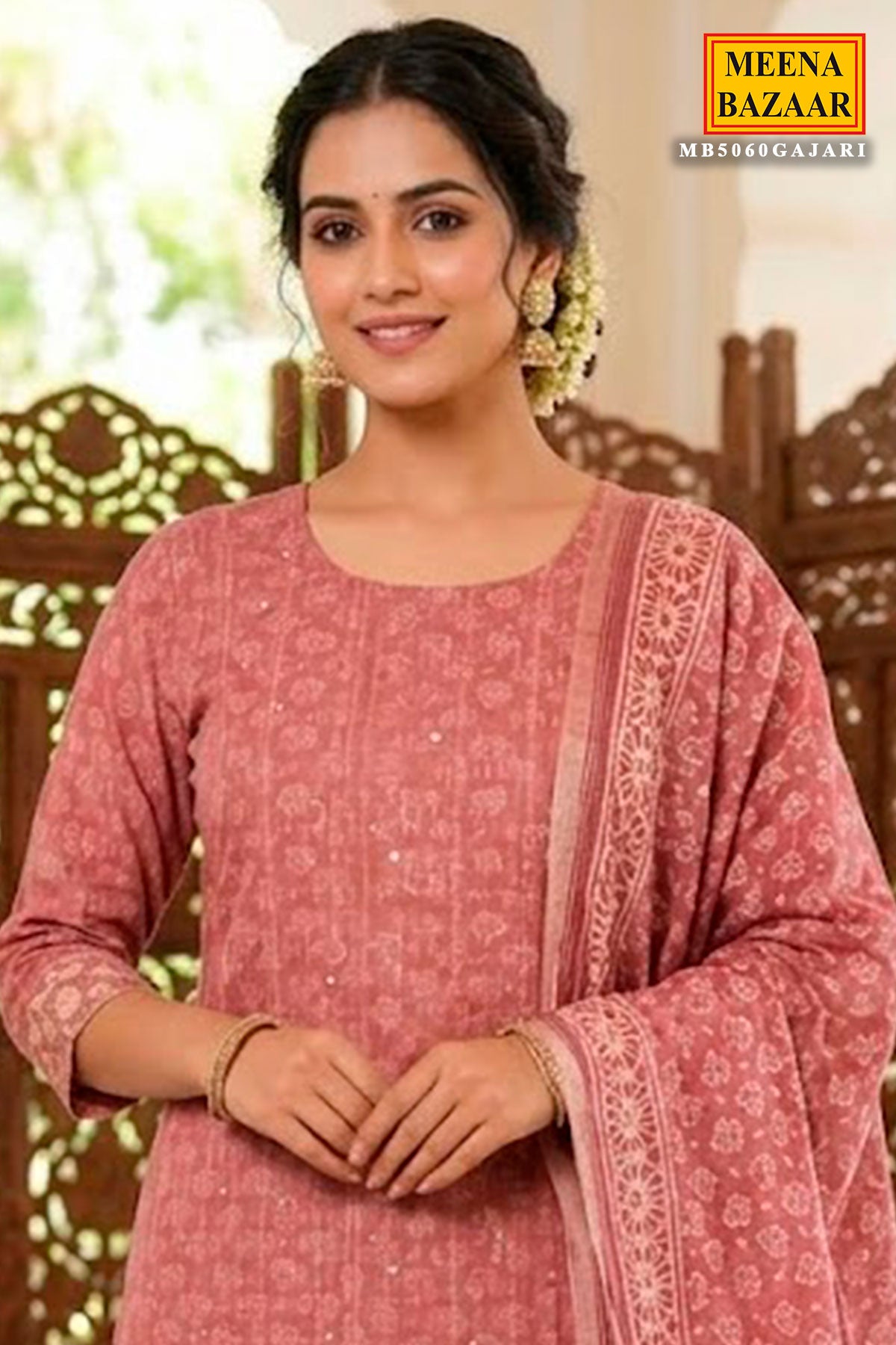This elegant gajari printed suit piece set beautifully blends traditional charm with understated sophistication through its warm, earthy tone and intricate detailing. Crafted from a soft, breathable fabric, the kurta features a muted gajari base adorned with delicate all-over ethnic prints that lend a graceful and refined appeal. The design is subtly elevated with intricate motifs along the hemline, adding a hint of artisanal richness. The straight-cut silhouette with three-quarter sleeves ensures a comfortable yet flattering fit, making it perfect for all-day wear.
