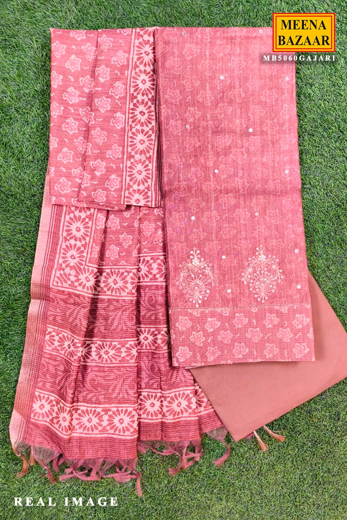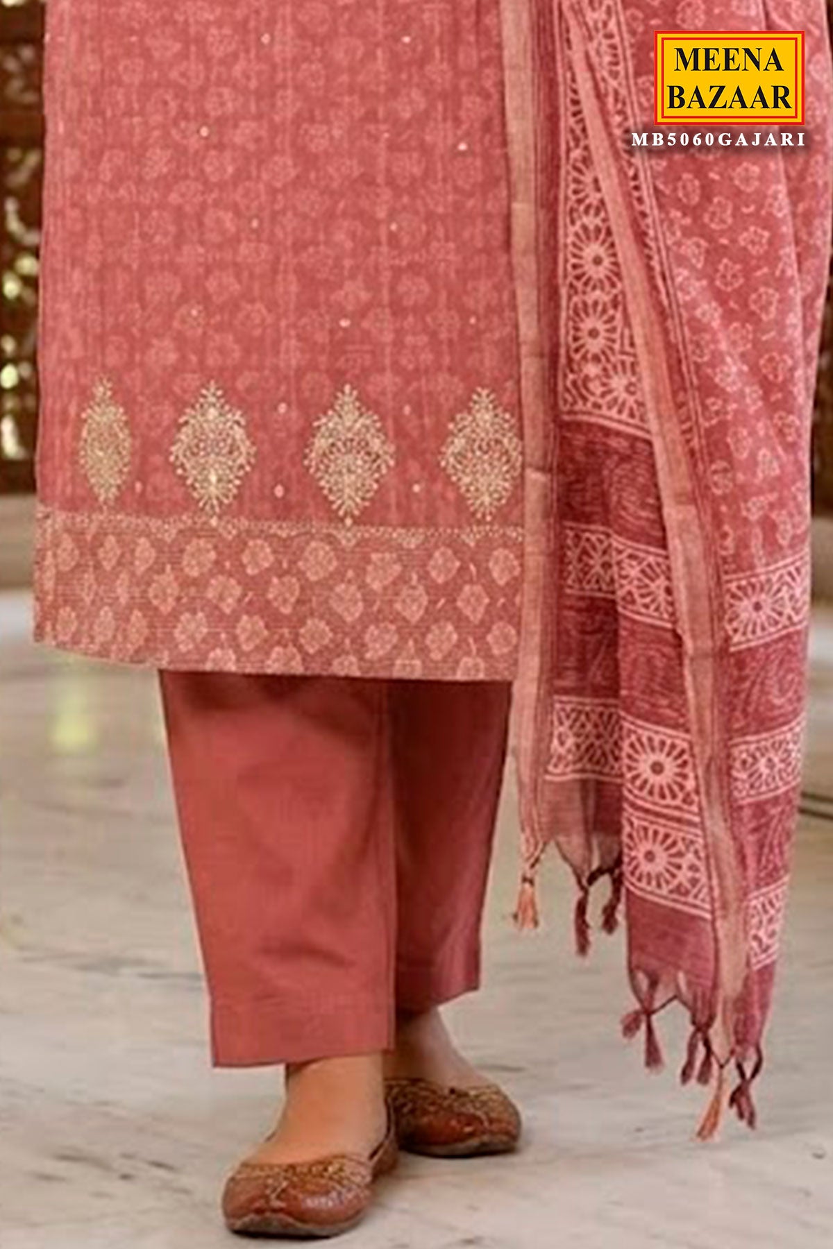 It is paired with coordinated solid trousers in a matching gajari shade, offering a harmonious and well-balanced look that complements the printed kurta effortlessly. The ensemble is completed with a beautifully printed dupatta, featuring traditional patterns and finely detailed borders with tassel accents that enhance its overall elegance. Ideal for festive occasions, casual gatherings, and daytime celebrations, this suit set exudes timeless ethnic grace with a modern touch.