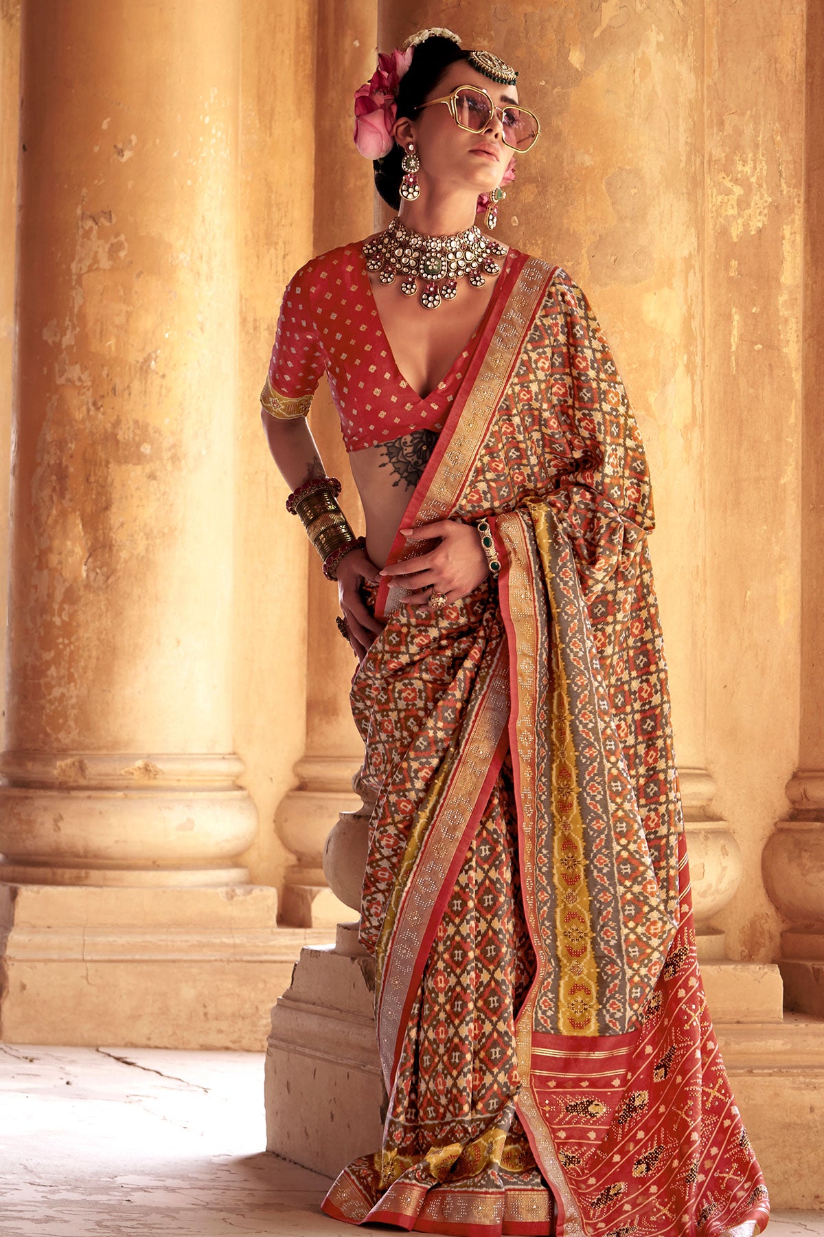 Elevate your festive and occasion wear collection with this luxurious brown silk saree, crafted to perfection for timeless elegance. The rich silk fabric offers a graceful drape and premium feel, making it ideal for celebrations and special gatherings. Adorned with intricate Siroski work, the saree adds a subtle shimmer that enhances its sophisticated appeal. The classic Ratnamani design brings a refined traditional touch, blending heritage artistry with modern luxury. Pair it with statement jewelry to complete a stunning and graceful look.Please Note: There may be a slight difference in the product color due to lighting and screen reflections. The blouse worn by the model is for styling and representation purposes only. The blouse is available in Fabric.