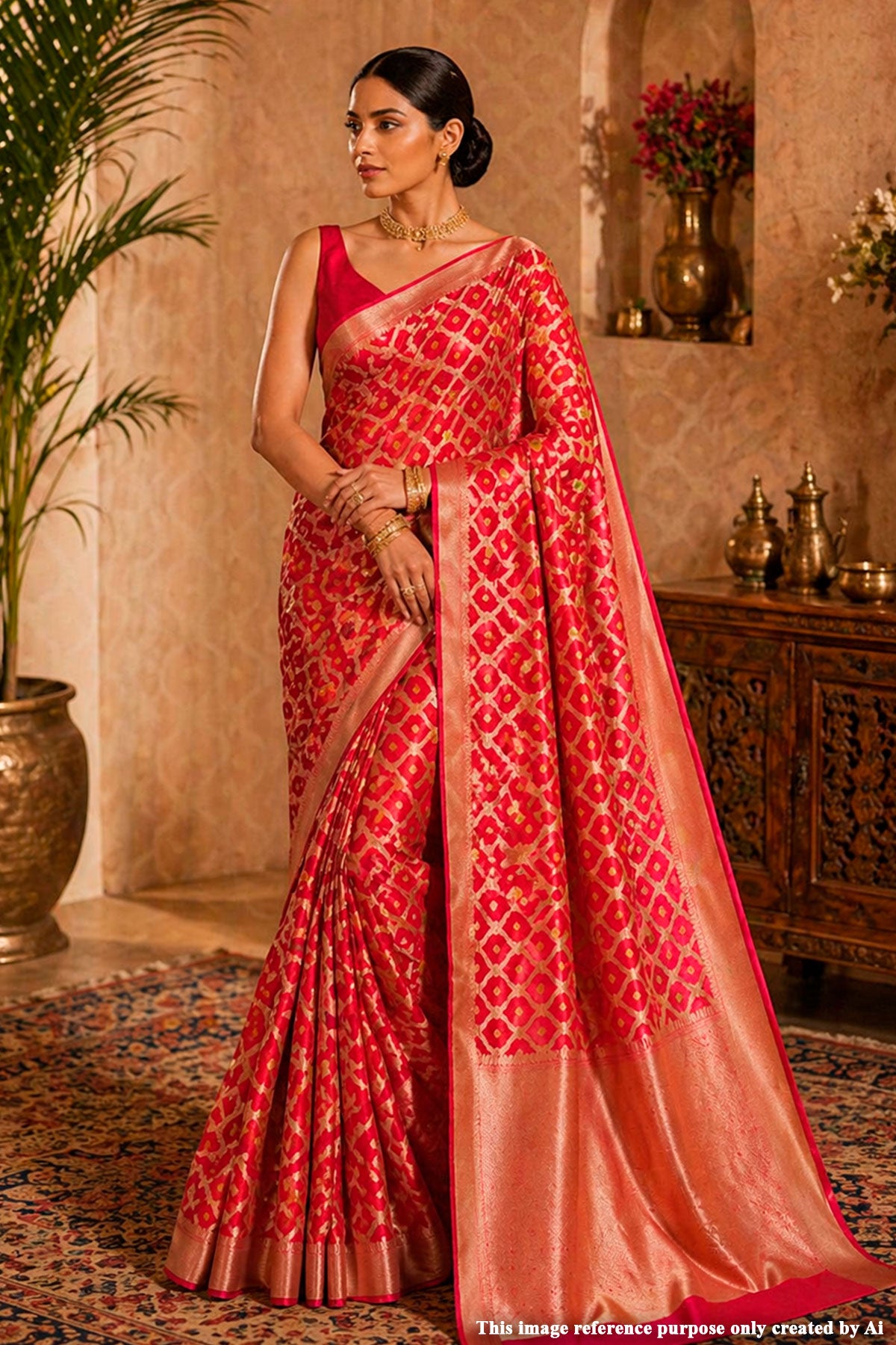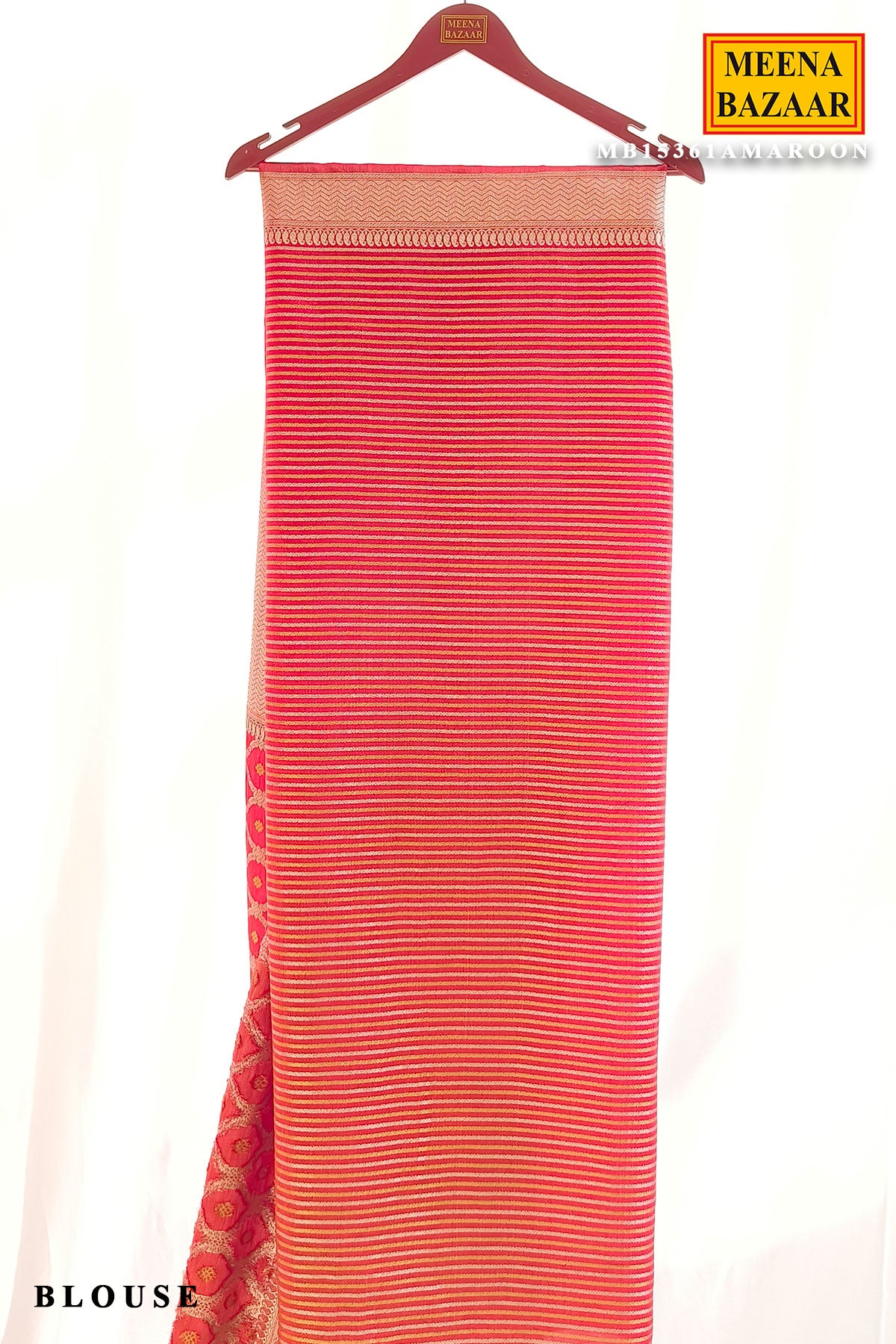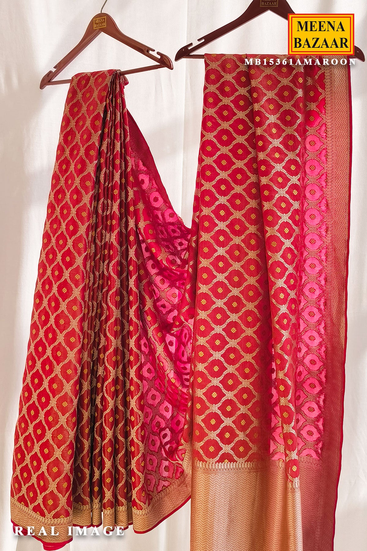 Drape yourself in timeless sophistication with this exquisite maroon saree from Meena Bazaar, designed to capture effortless grace and refined charm. Crafted from lustrous silk, the saree features delicate golden motifs scattered across the body, adding a subtle shimmer with every movement.