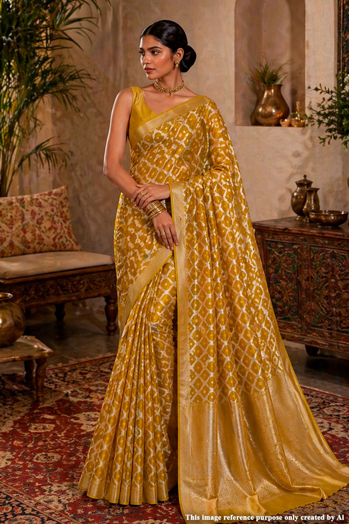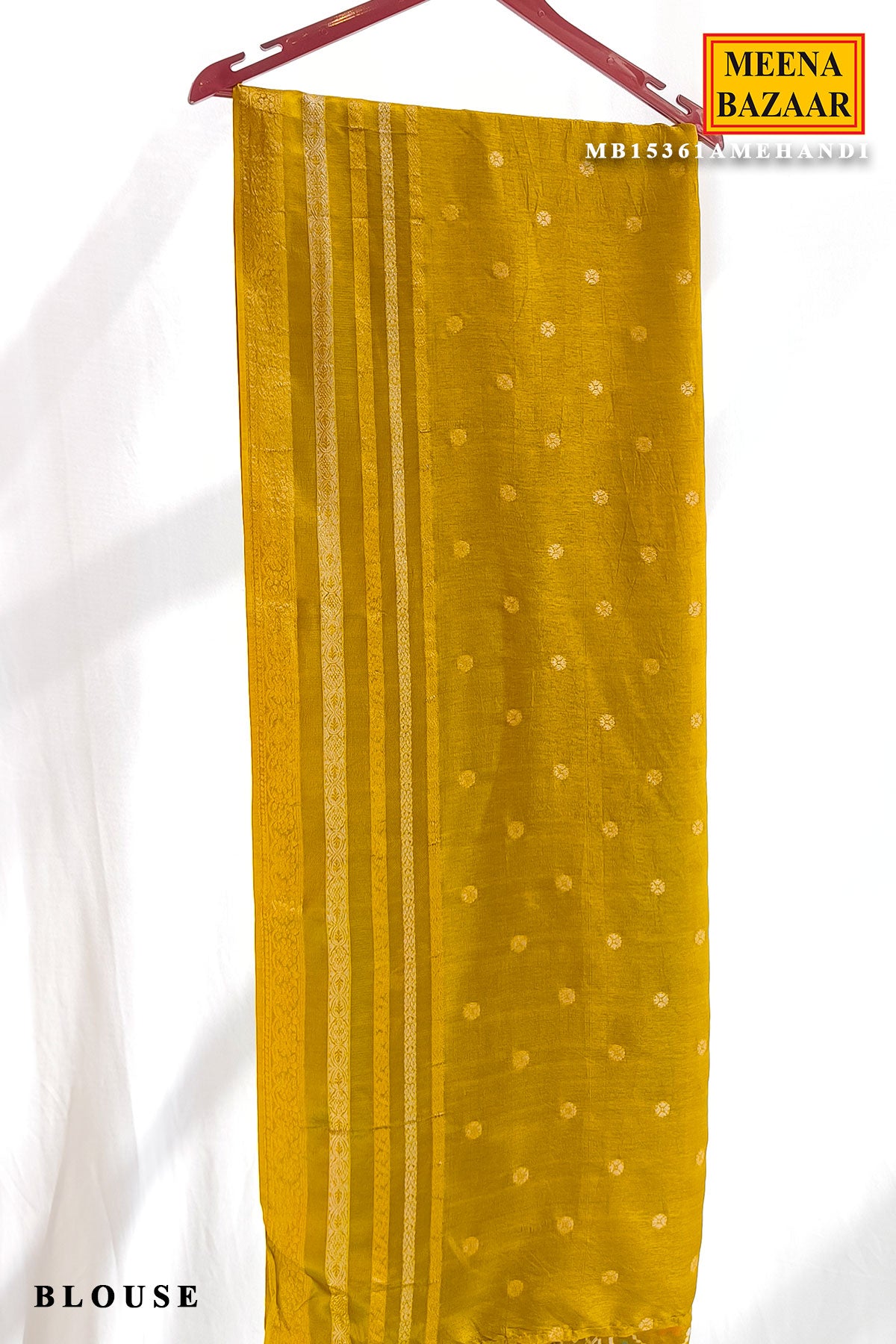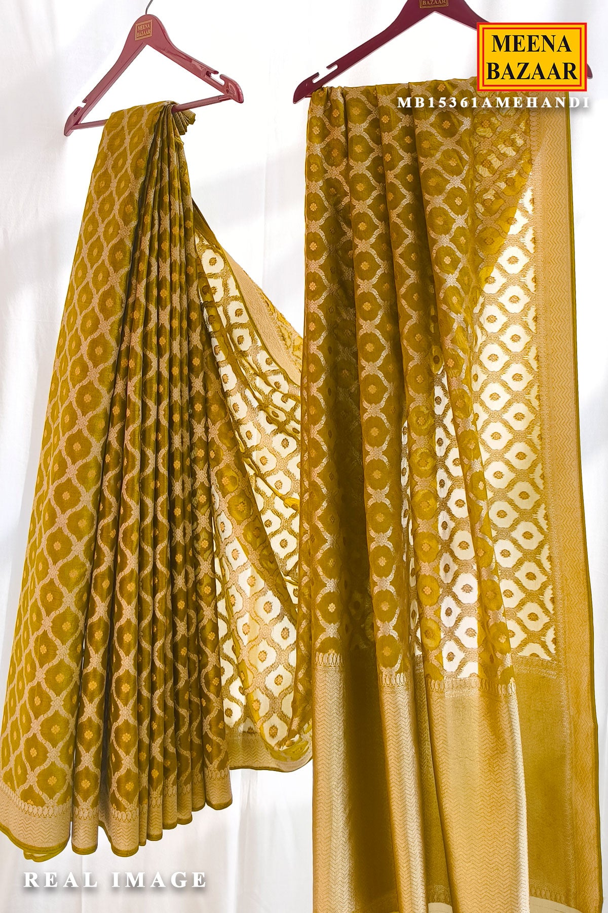 Drape yourself in timeless sophistication with this exquisite mehandi saree from Meena Bazaar, designed to capture effortless grace and refined charm. Crafted from lustrous silk, the saree features delicate golden motifs scattered across the body, adding a subtle shimmer with every movement.