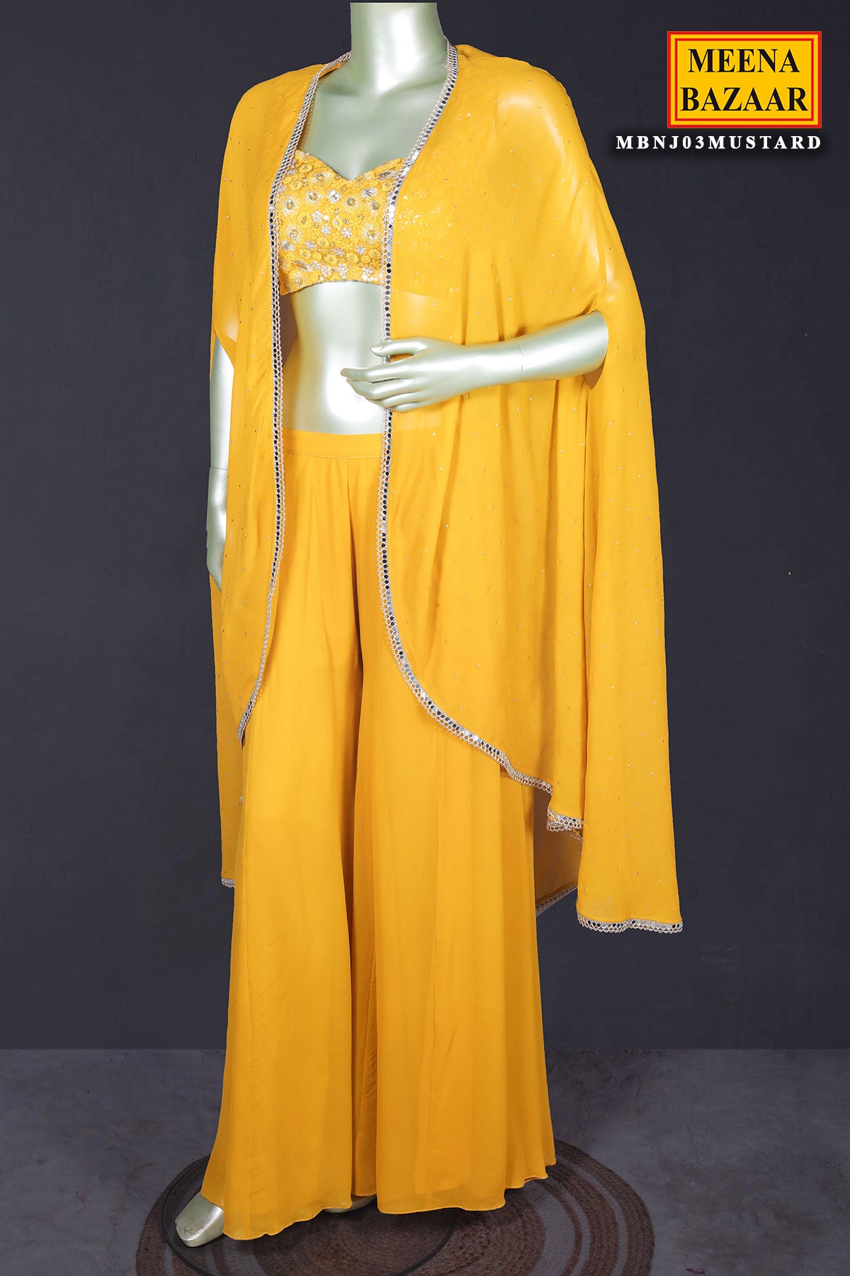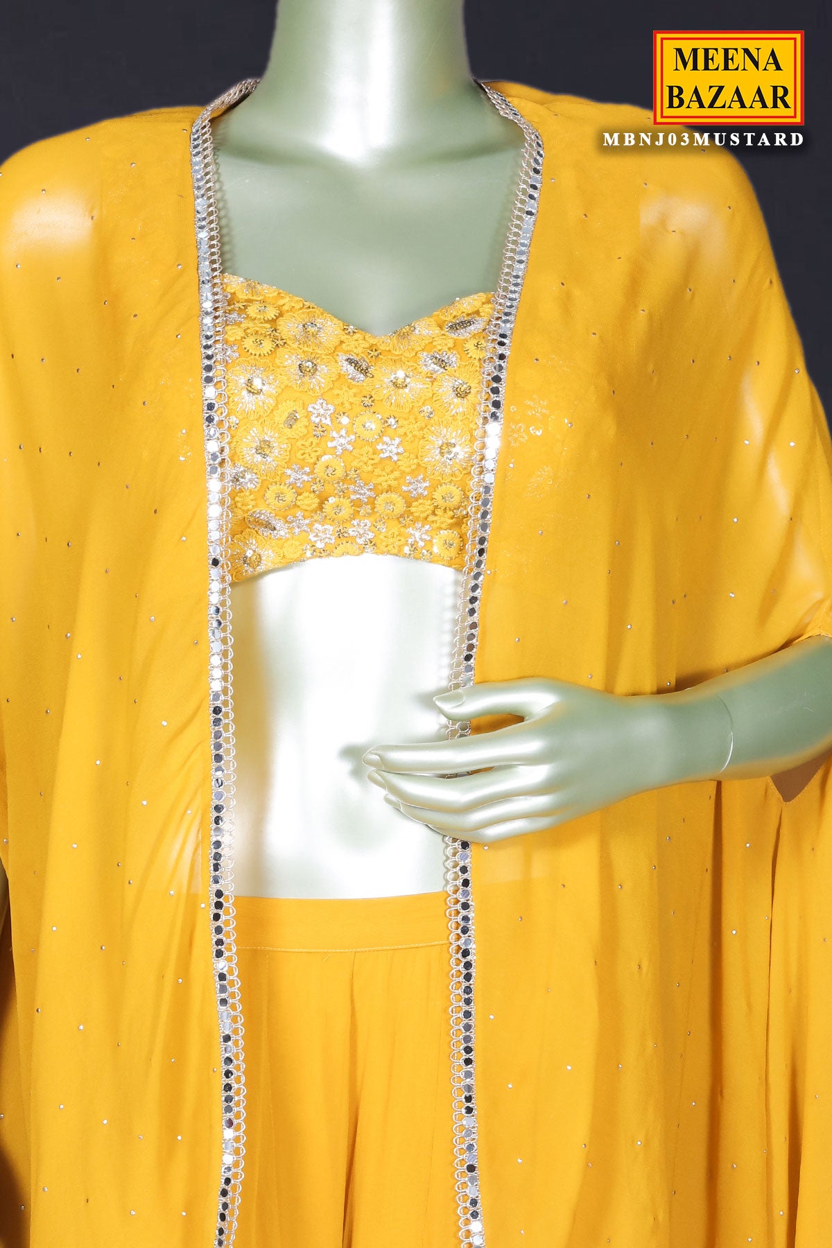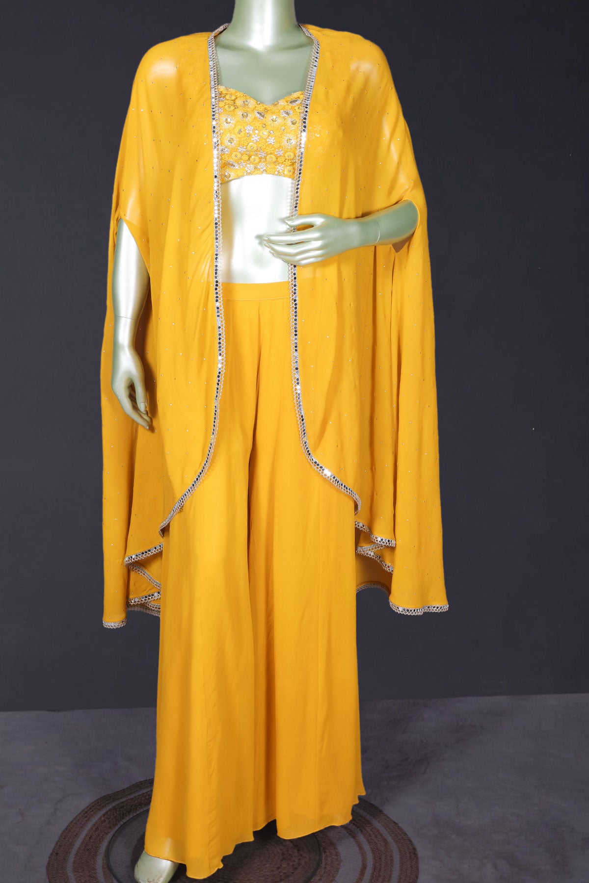 Make a fashion statement with our dynamic Mustard Georgette Embroidered Bustier-Skirt with Cape 3-Piece Co-ord Set perfect for those who love to stand out in a crowd. The gorgeous printed co-ord is a perfect blend of style and tradition and is sure to make a lasting impression. The bustier of this 3-piece co-ord features beautiful sequins & resham thread embroidery to ace up the appeal. It is complete with a mirror embellished cape and matching bottoms. Style Tip: Pair this ensemble with contrasting accessories, block heels, and other fashion accessories, to complete your look. Note: Color may slightly be different from the actual item due to photographic lighting sources or the monitor's settings.