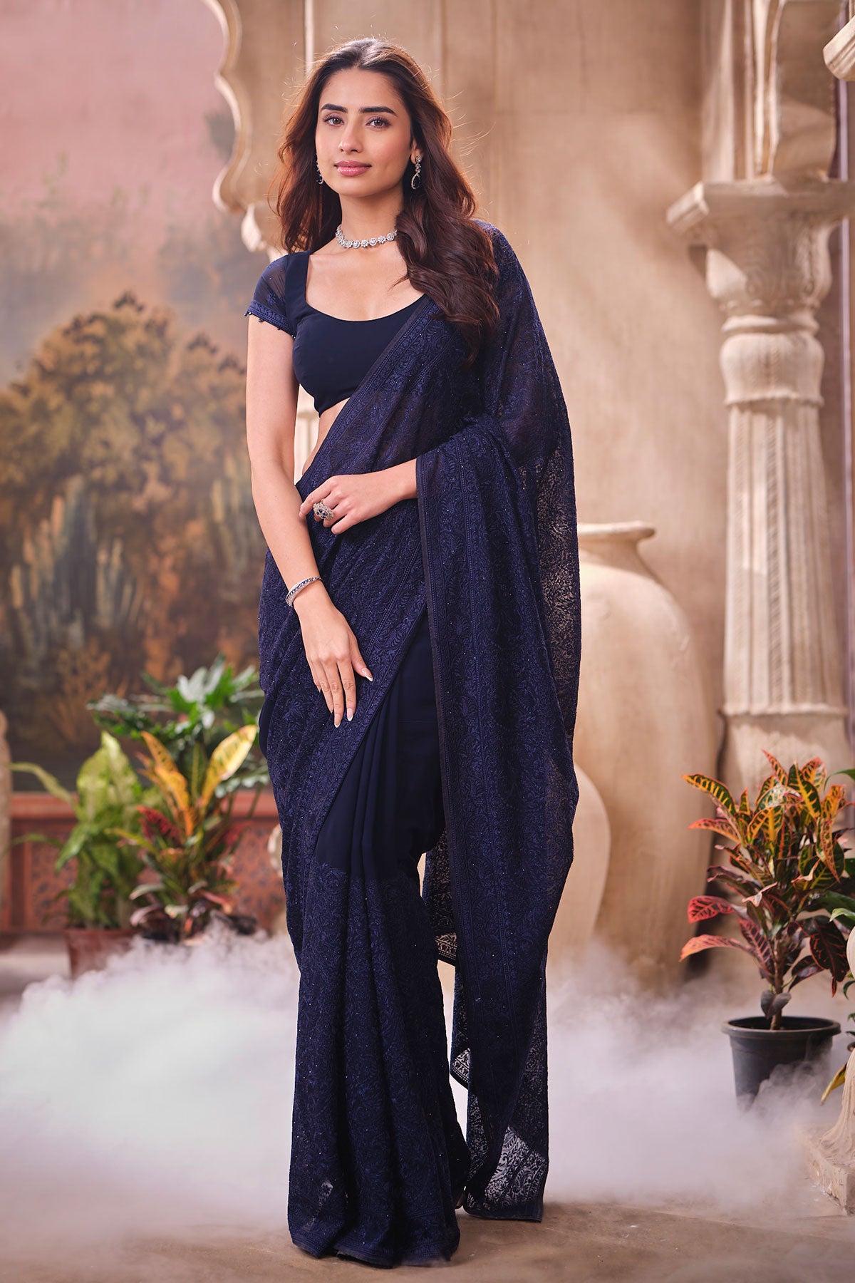 Navy Blue Georgette Embroidered Saree Elegant Party & Festive Wear