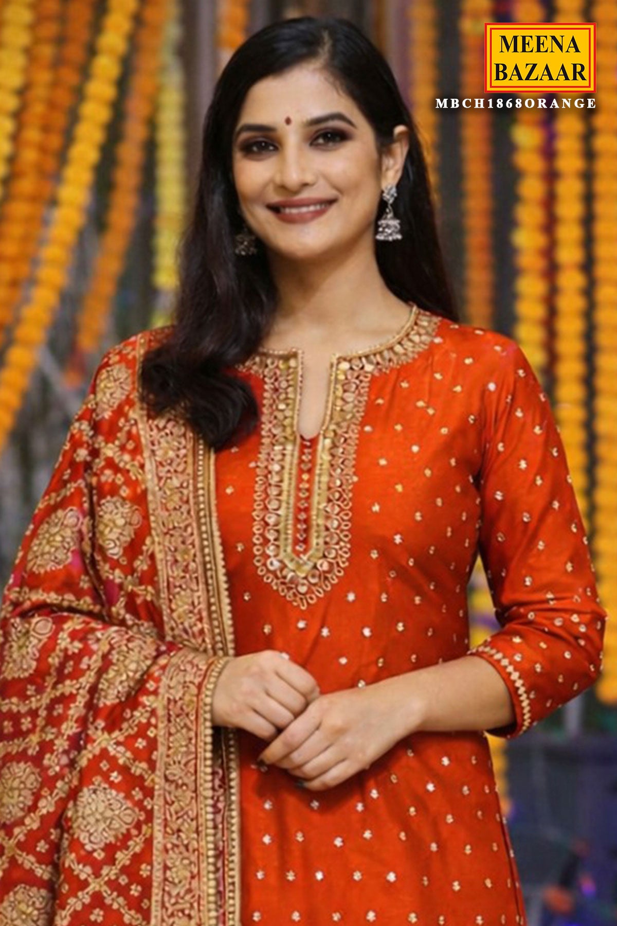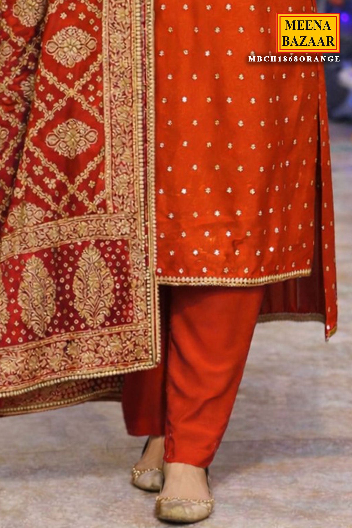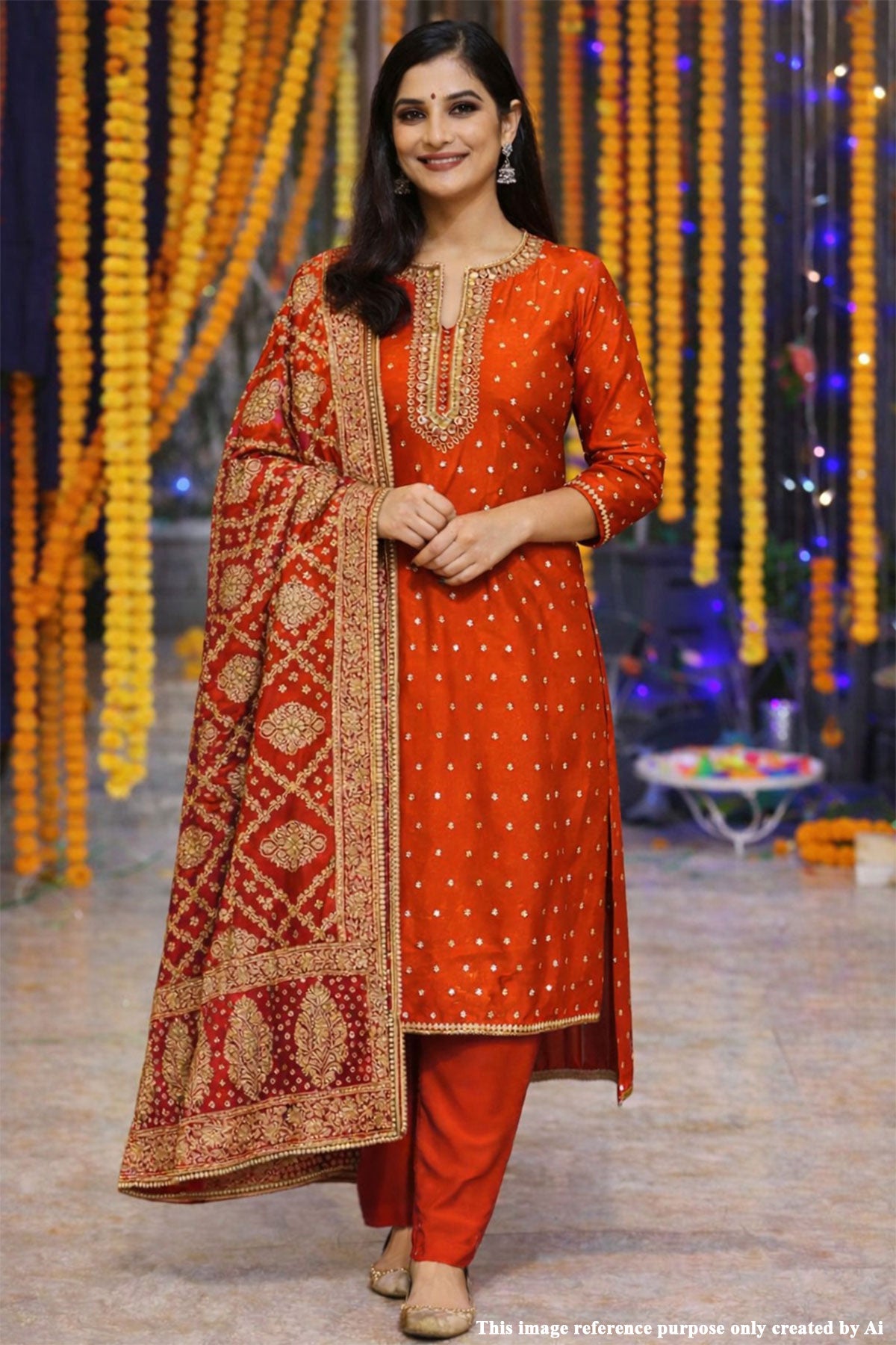 This elegant orange ethnic unstitched suit set features a beautifully crafted kurta adorned with delicate gold butti work and an intricately embroidered neckline that adds a refined festive touch. The highlight of the ensemble is its rich Banarasi-style dupatta, designed with detailed gold zari motifs arranged in classic diamond patterns and finished with a luxurious traditional border featuring floral and paisley elements. Paired with matching solid pants, this outfit perfectly blends traditional craftsmanship with graceful style, making it an ideal choice for weddings, festive celebrations, cultural events, and special occasions.