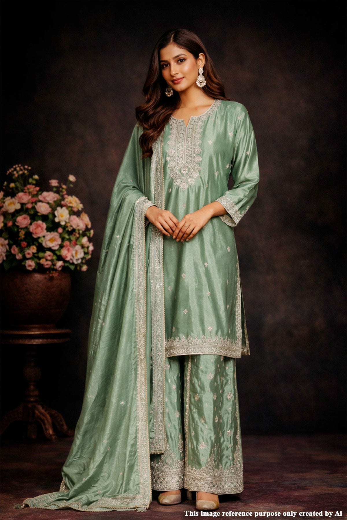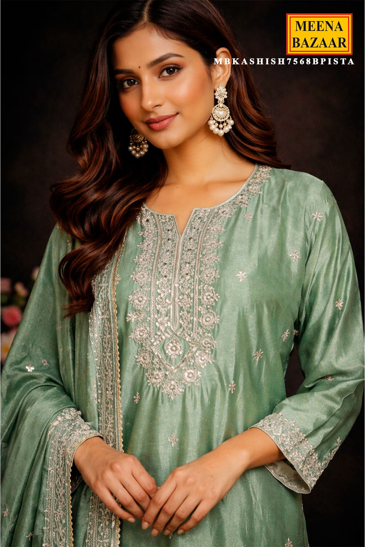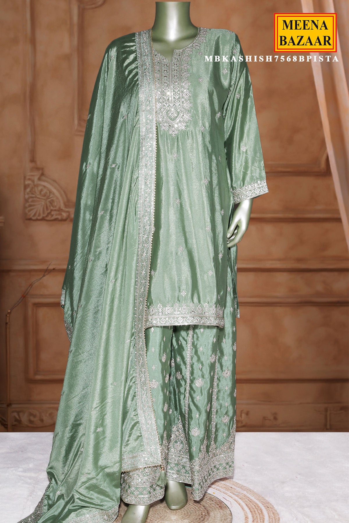 Refresh your ethnic wardrobe with this elegant pista green chinon embroidered readymade suit from Meena Bazaar, designed to offer a perfect blend of grace, comfort, and modern style. Crafted from premium chinon fabric, this suit features a lightweight, flowy drape that enhances your overall look while ensuring all-day comfort. The outfit is beautifully detailed with intricate embroidery work, adding a refined and luxurious touch. Designed as a readymade suit, it provides a ready-to-wear fit, eliminating the need for stitching and making it ideal for quick and effortless styling. The soft pista green color tone adds a fresh and sophisticated appeal, perfect for festive occasions, party wear, and office gatherings.