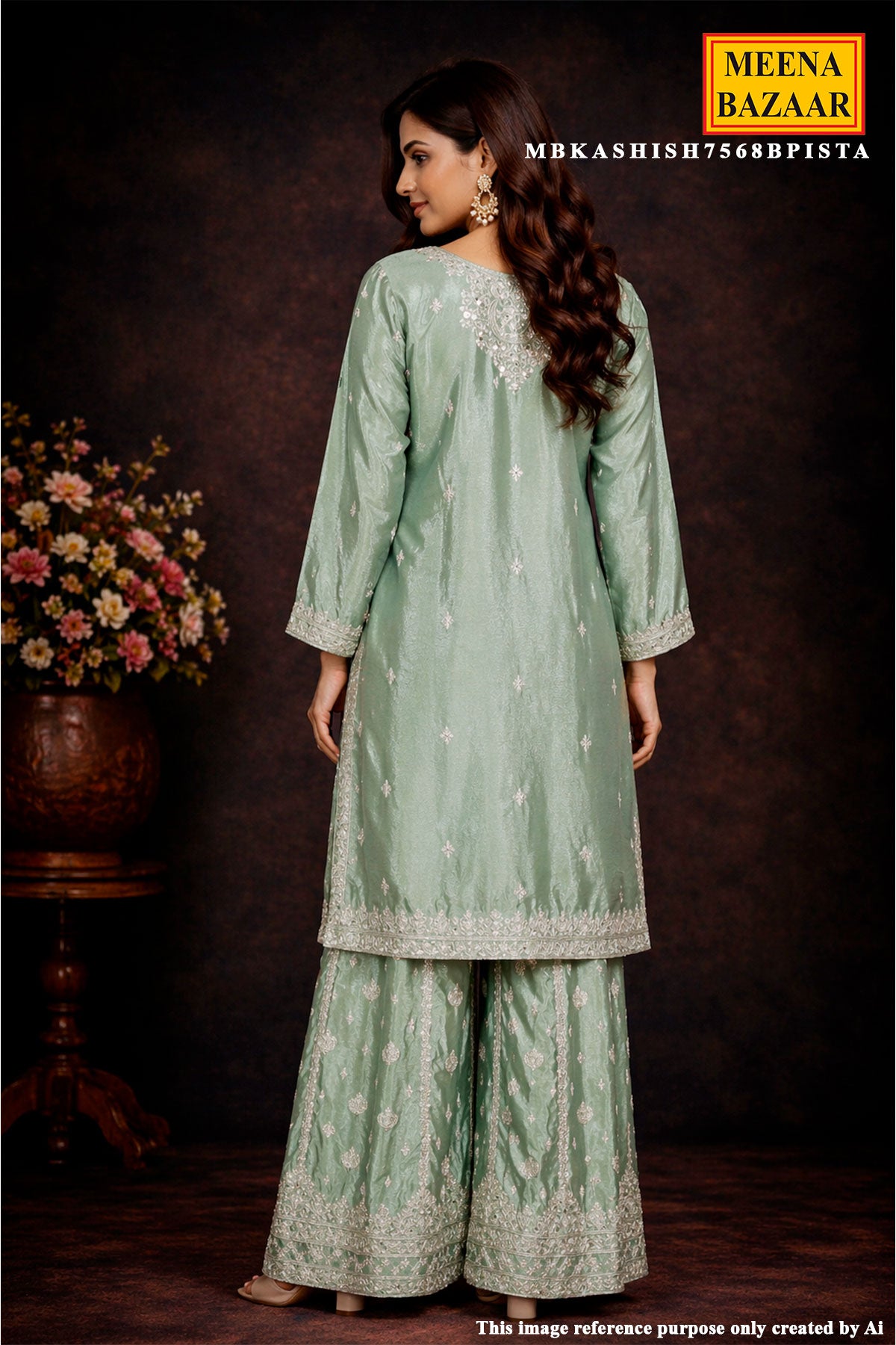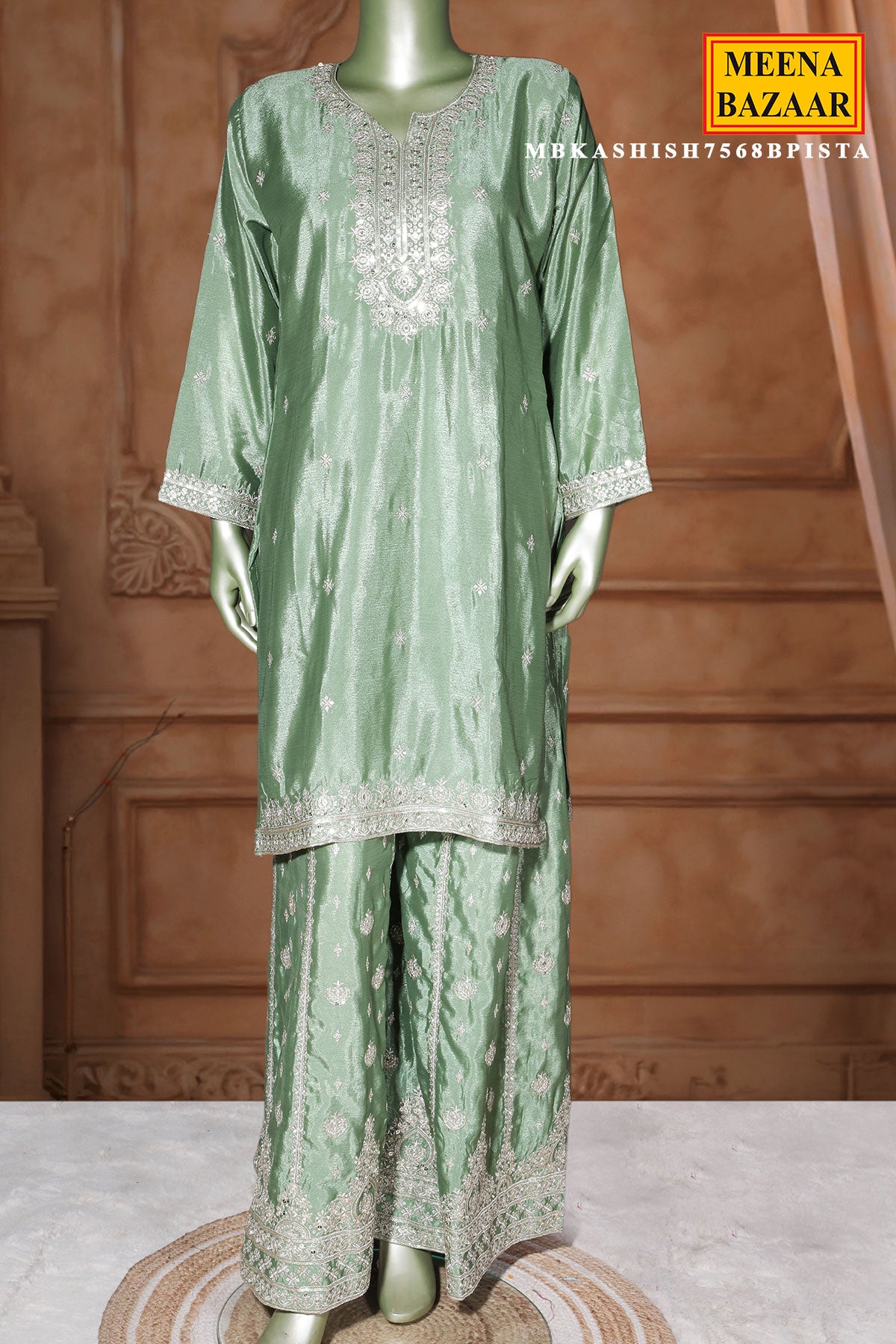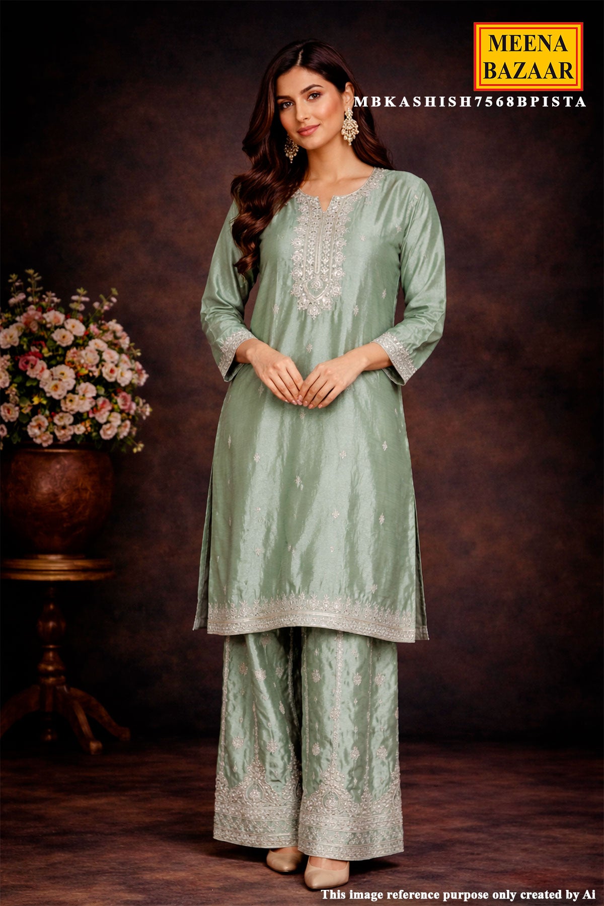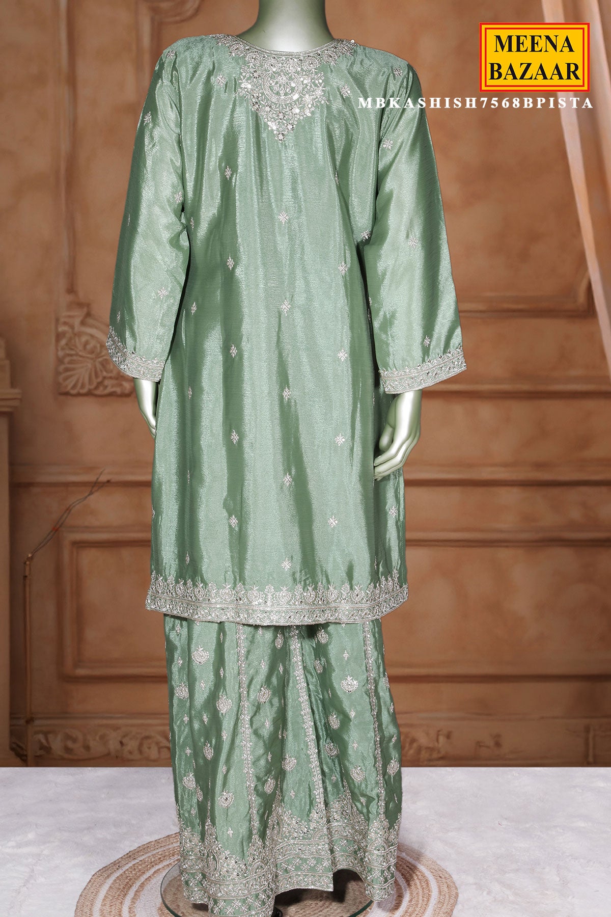 Refresh your ethnic wardrobe with this elegant pista green chinon embroidered readymade suit from Meena Bazaar, designed to offer a perfect blend of grace, comfort, and modern style. Crafted from premium chinon fabric, this suit features a lightweight, flowy drape that enhances your overall look while ensuring all-day comfort. The outfit is beautifully detailed with intricate embroidery work, adding a refined and luxurious touch. Designed as a readymade suit, it provides a ready-to-wear fit, eliminating the need for stitching and making it ideal for quick and effortless styling. The soft pista green color tone adds a fresh and sophisticated appeal, perfect for festive occasions, party wear, and office gatherings.