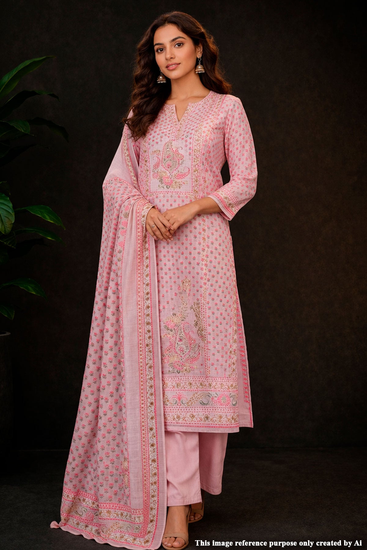 Embrace timeless grace with this Poise Pink suit set. This ensemble features a beautifully structured kurta adorned with delicate paisley motifs and a detailed yoke that exudes sophistication. Crafted from a premium cotton blend, it offers a comfortable fit. The set is complete with coordinated straight-fit trousers and a matching dupatta featuring a broad ethnic border. A perfect choice for everyday styling , office wear and casual outings