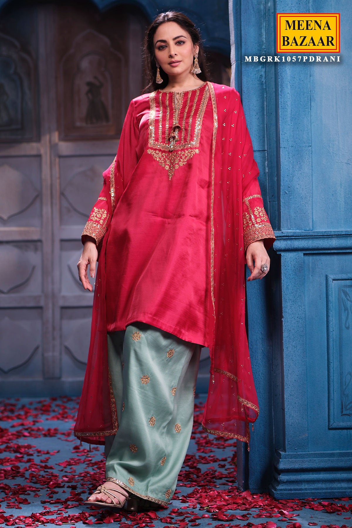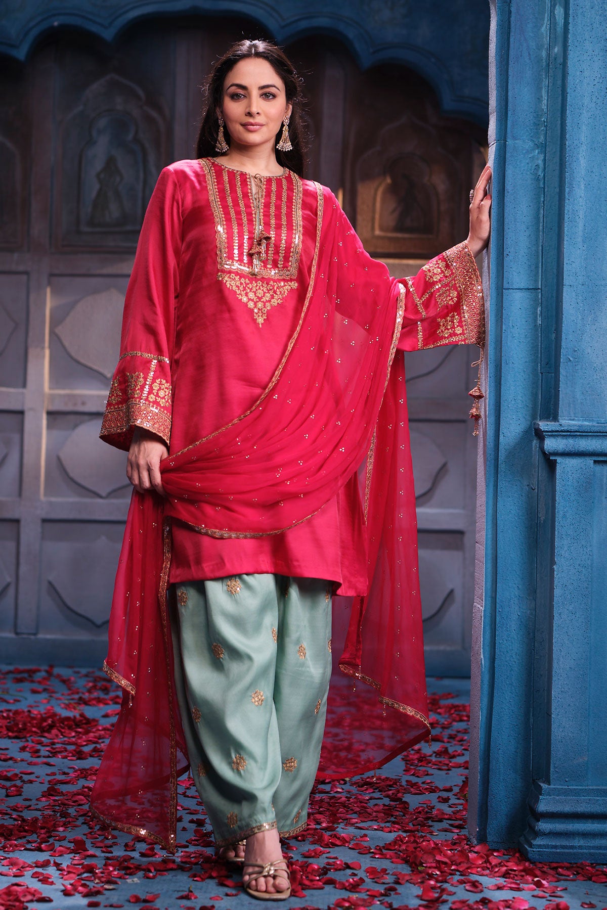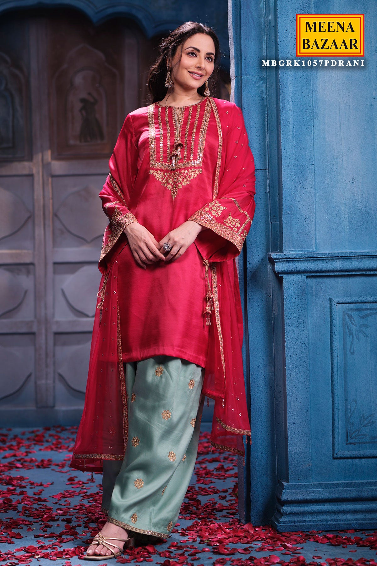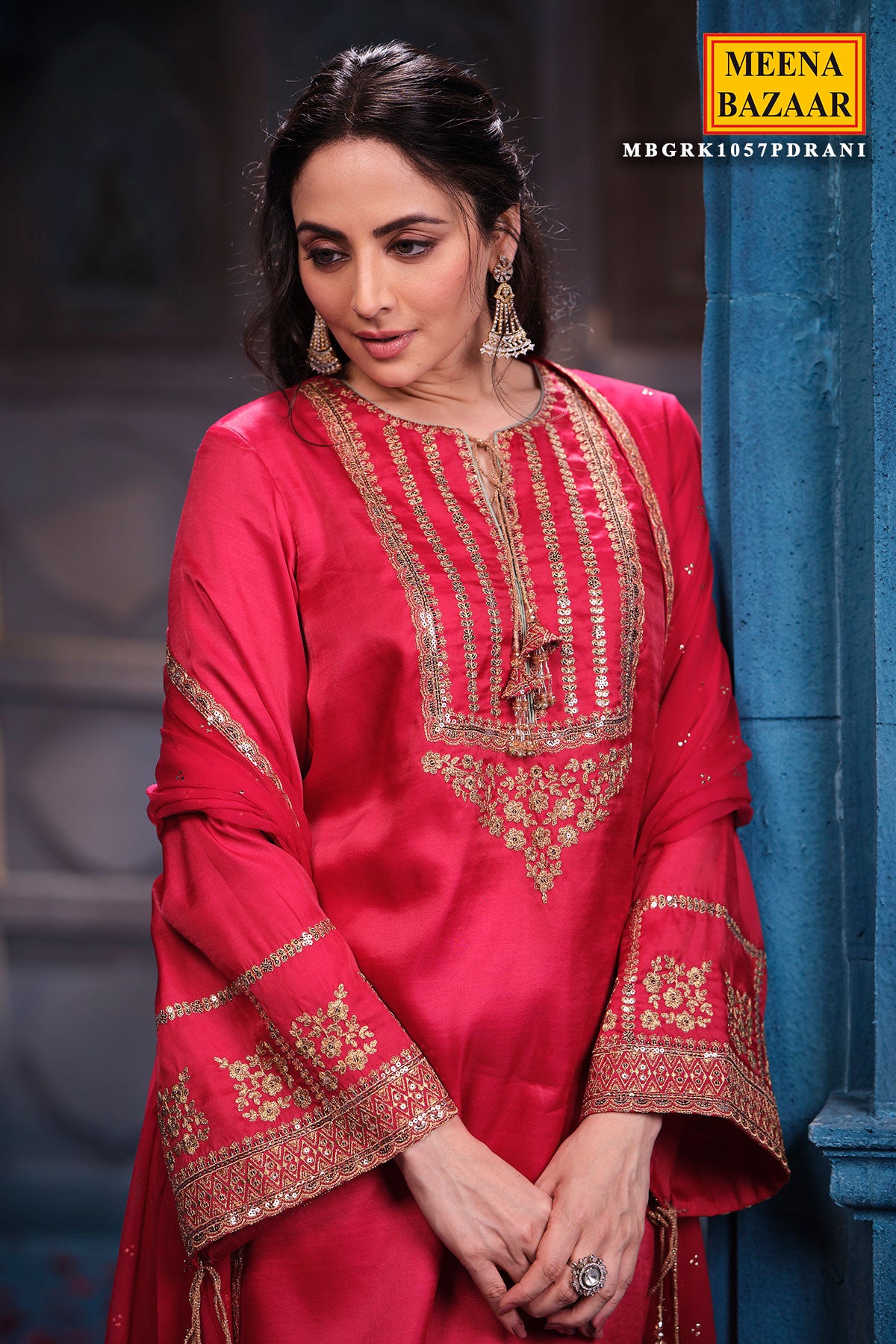 This is Rani Rani Silk Shirt Set with Chiffon Dupatta. Crafted with a premium silk shirt and silk bottom, this outfit offers a rich texture and luxurious drape that enhances its festive appeal. The vibrant rani pink shade adds a regal charm, making it a perfect choice for festive celebrations, weddings, sangeet functions, parties, and special occasions. The ensemble is paired with a lightweight chiffon dupatta, which adds soft flow and elegance to the overall look. Designed for both comfort and sophistication, this silk festive suit set beautifully blends traditional craftsmanship with modern styling. Pair it with statement jewell.