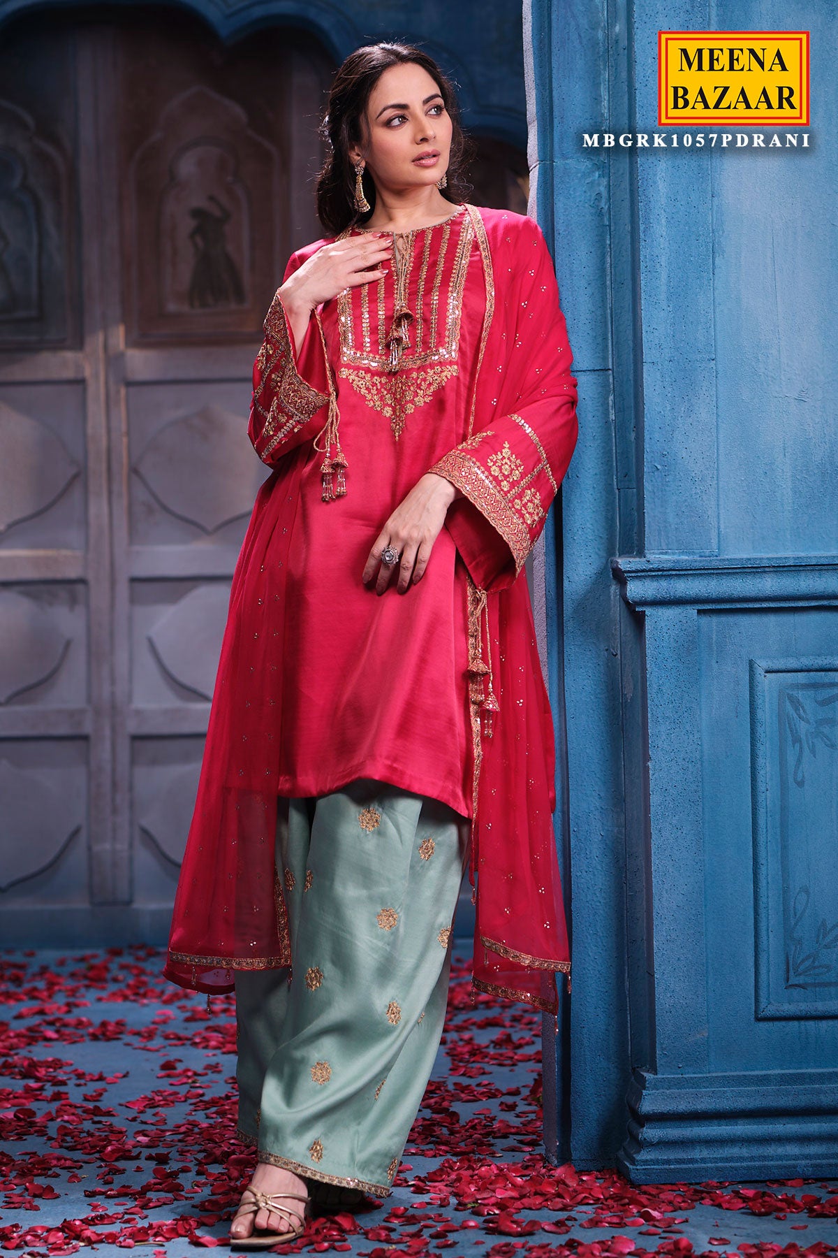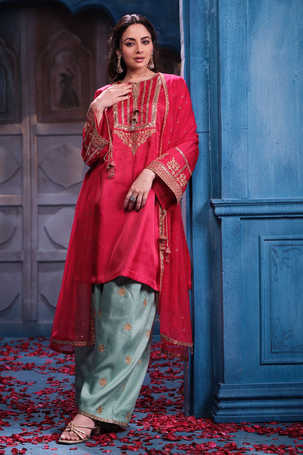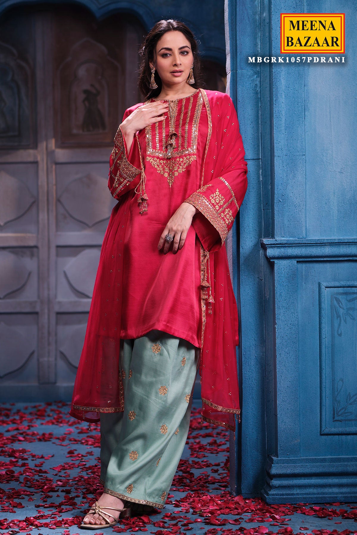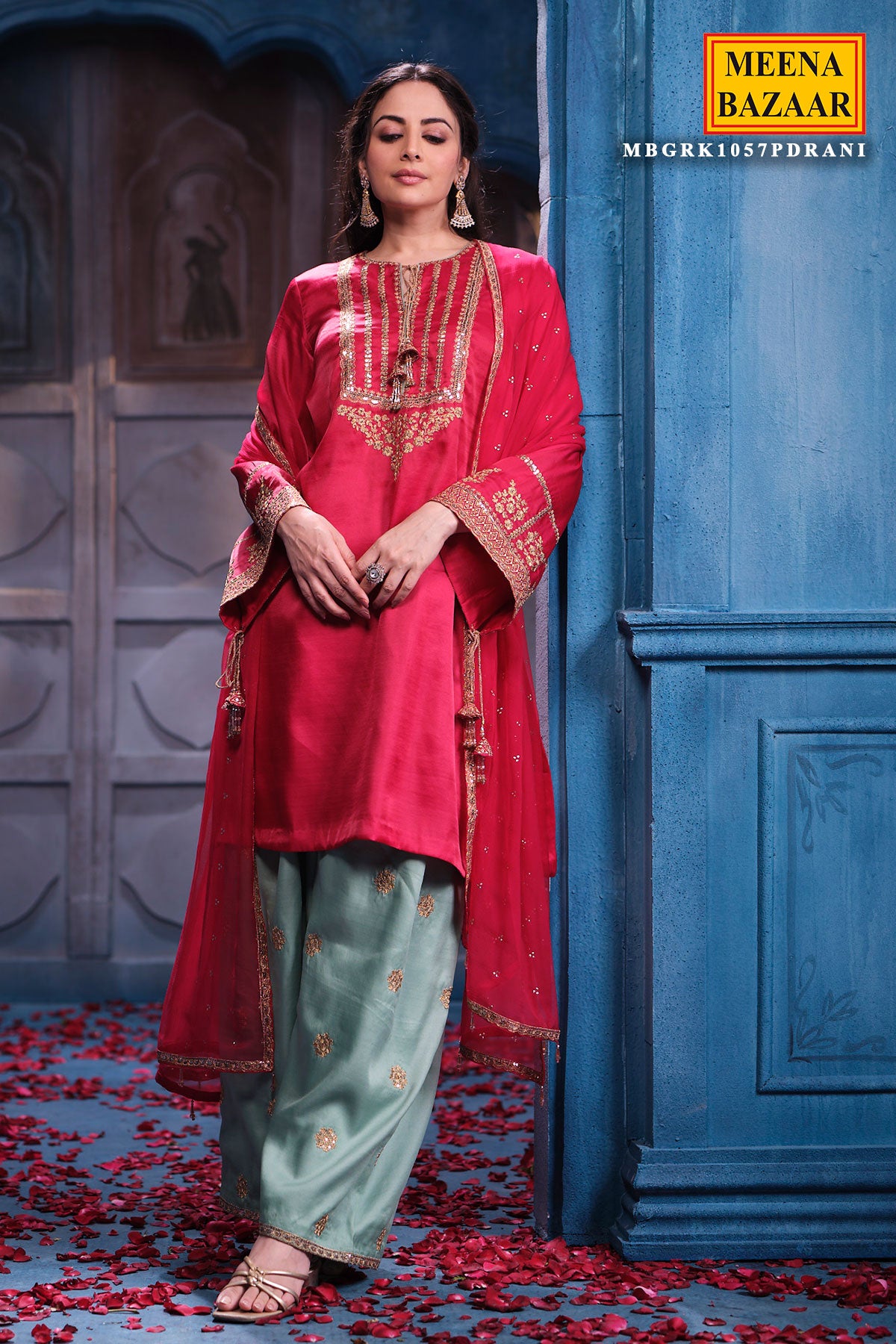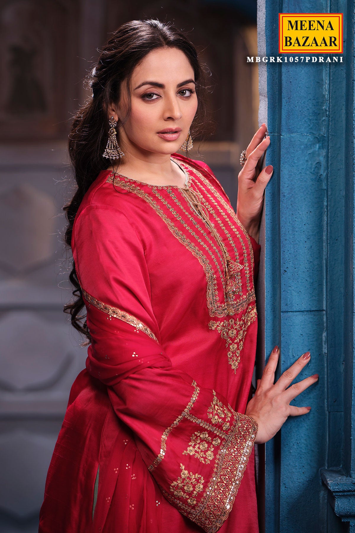 This is Rani Rani Silk Shirt Set with Chiffon Dupatta. Crafted with a premium silk shirt and silk bottom, this outfit offers a rich texture and luxurious drape that enhances its festive appeal. The vibrant rani pink shade adds a regal charm, making it a perfect choice for festive celebrations, weddings, sangeet functions, parties, and special occasions. The ensemble is paired with a lightweight chiffon dupatta, which adds soft flow and elegance to the overall look. Designed for both comfort and sophistication, this silk festive suit set beautifully blends traditional craftsmanship with modern styling. Pair it with statement jewell.