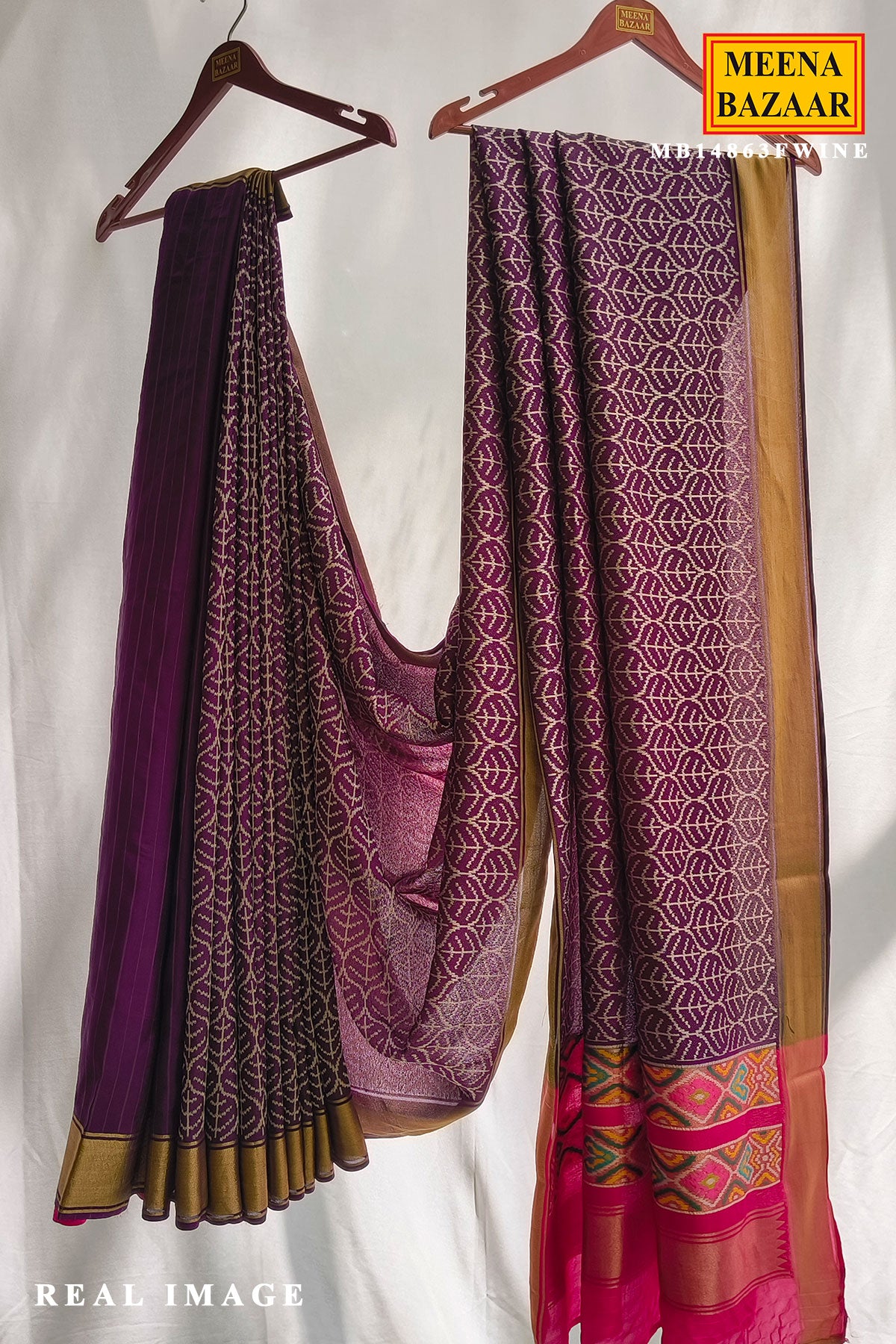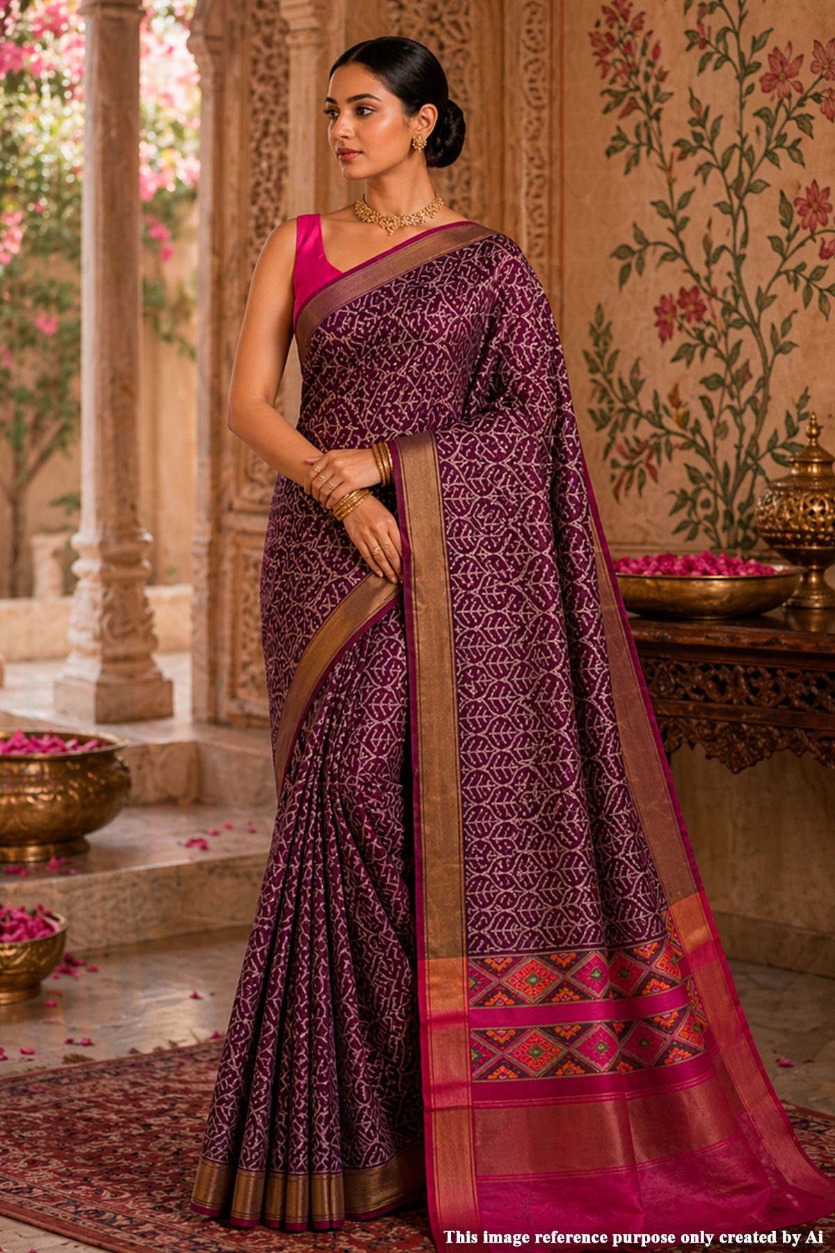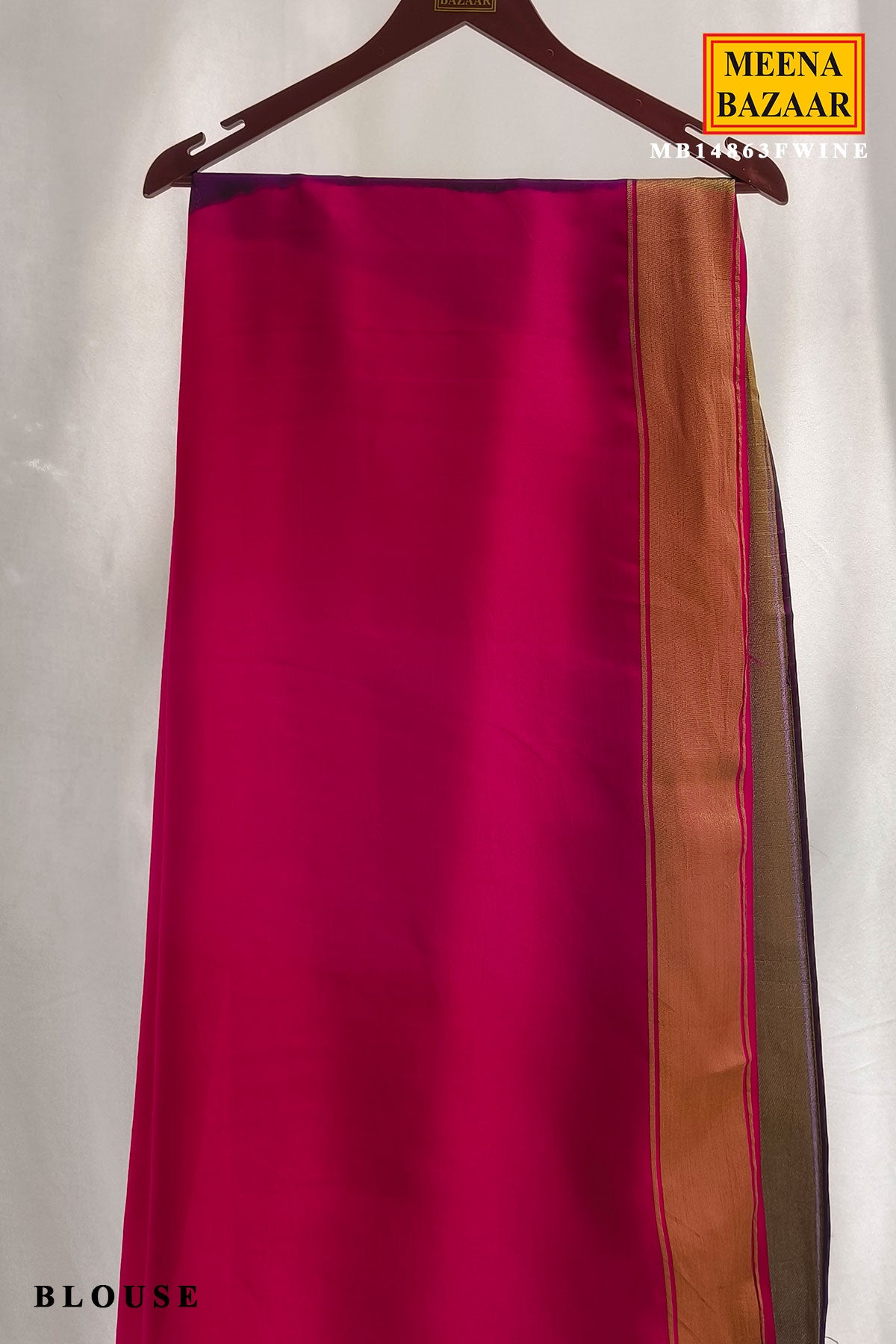 Step into effortless elegance with this stunning wine silk saree, a perfect blend of tradition and vibrant artistry. The rich, textured weave across the body adds depth and dimension, while the luminous golden border enhances its regal appeal.