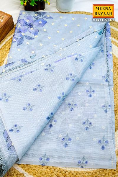 Blue Floral Printed Cotton Saree with Lace Detailing Border