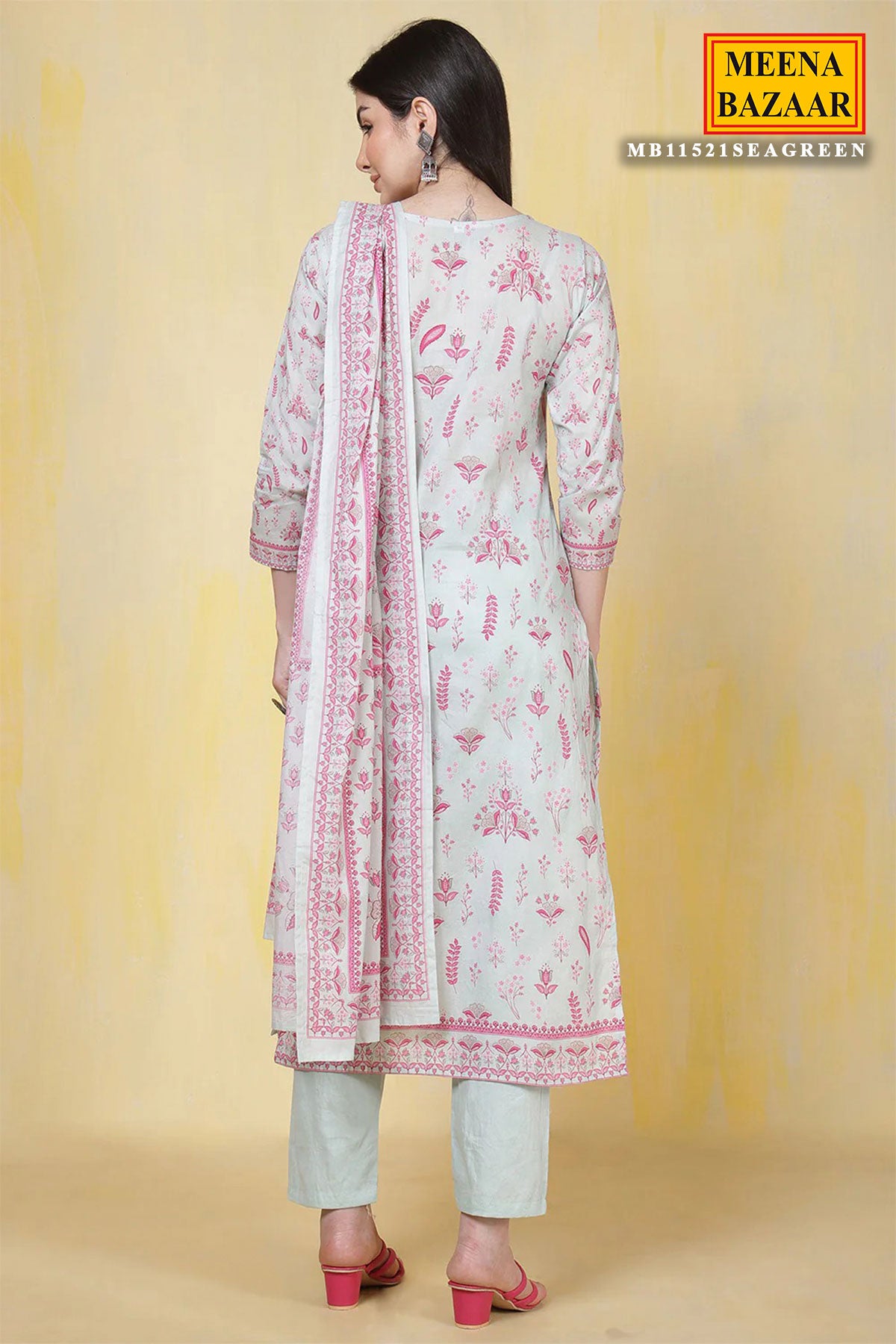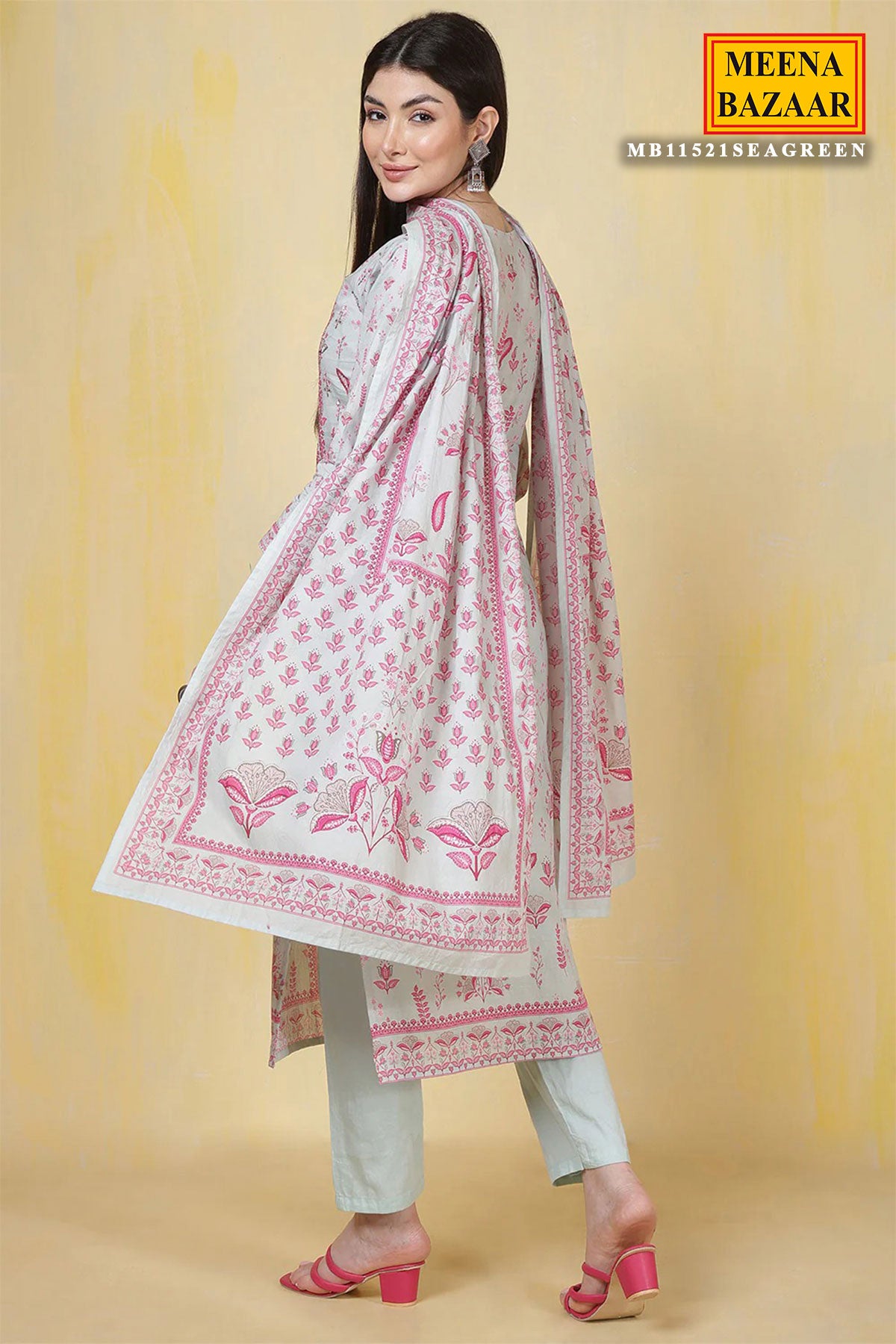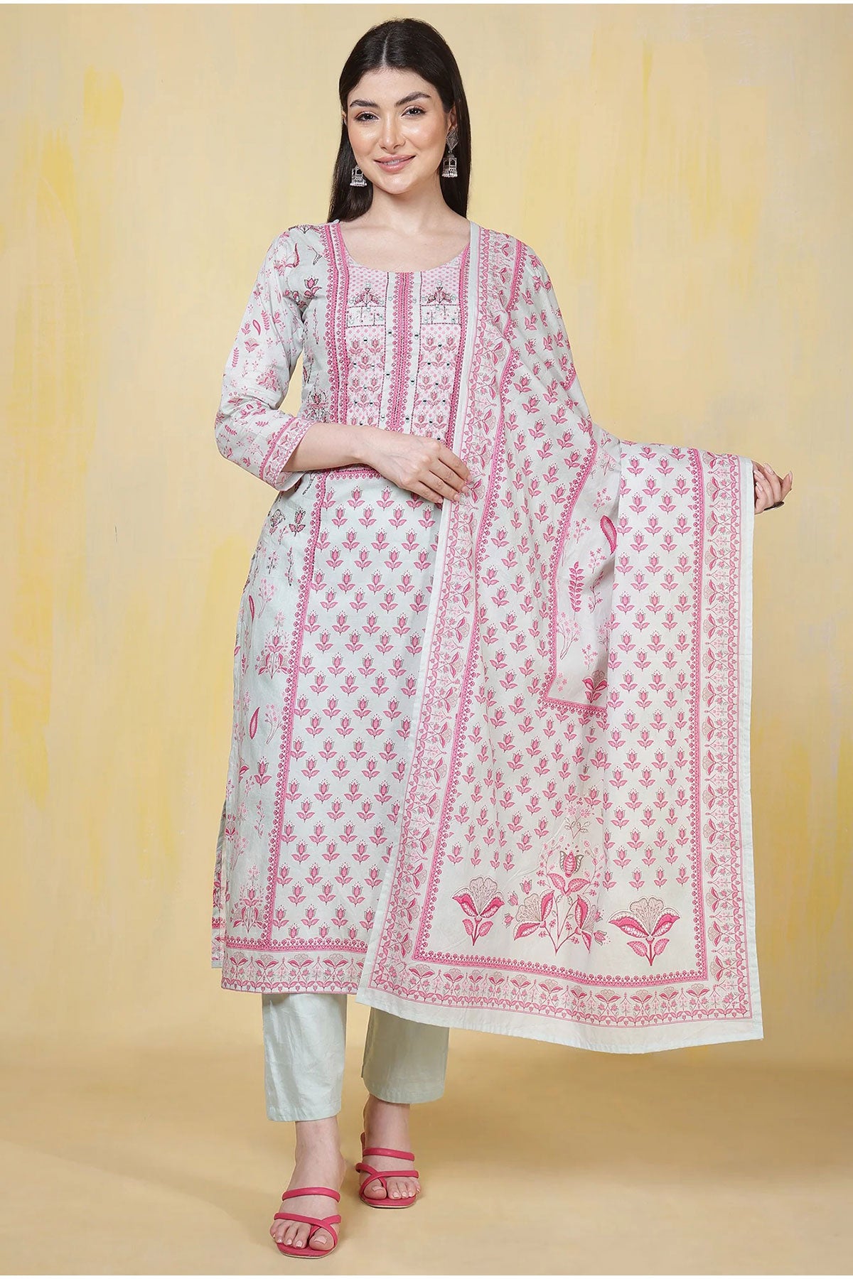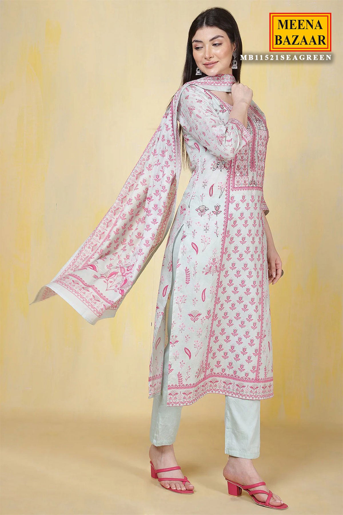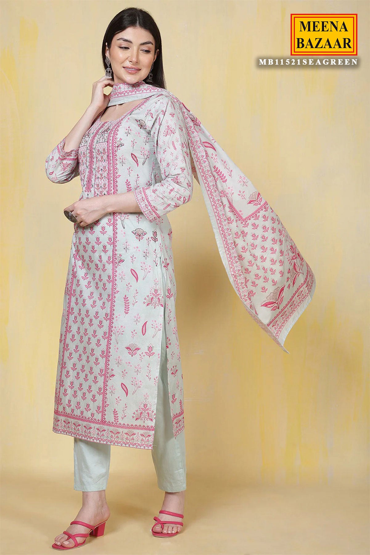 Refresh your ethnic wardrobe with this charming Light Blue Cotton Printed Straight Suit Set with Dupatta from Meena Bzaar. Crafted from soft, breathable cotton, the straight-cut kurti features delicate prints that add a subtle yet stylish appeal. The matching dupatta completes the ensemble, offering a coordinated and graceful look.