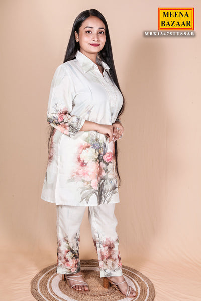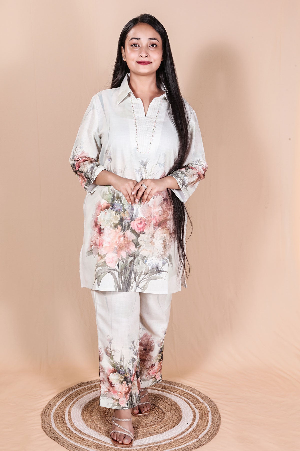 Explore the charm of our Light Sage Green Cotton Printed Cord Set and fetch compliments for your choice. This ensemble harmoniously fuses modern and traditional styles, ideal for various occasions. The exquisite floral print on the Kurti exudes an eye-catching allure, elevating this timeless ensemble to a wardrobe essential. The matching pants, add to the overall appeal. Style Tip: Complete your look by pairing it with matching heels and hoop earrings. Note: Colour may slightly differ from the actual item due to photographic lighting sources or the monitor's settings.