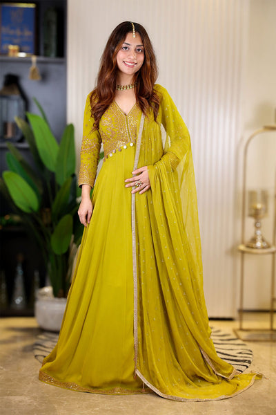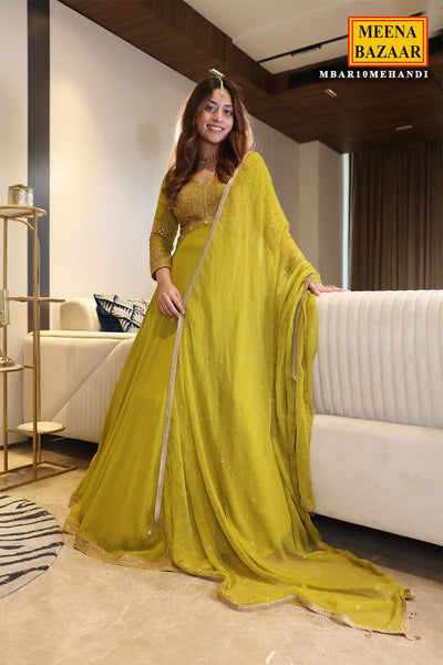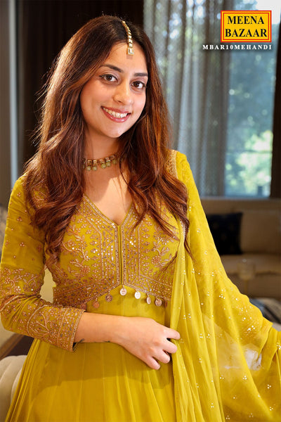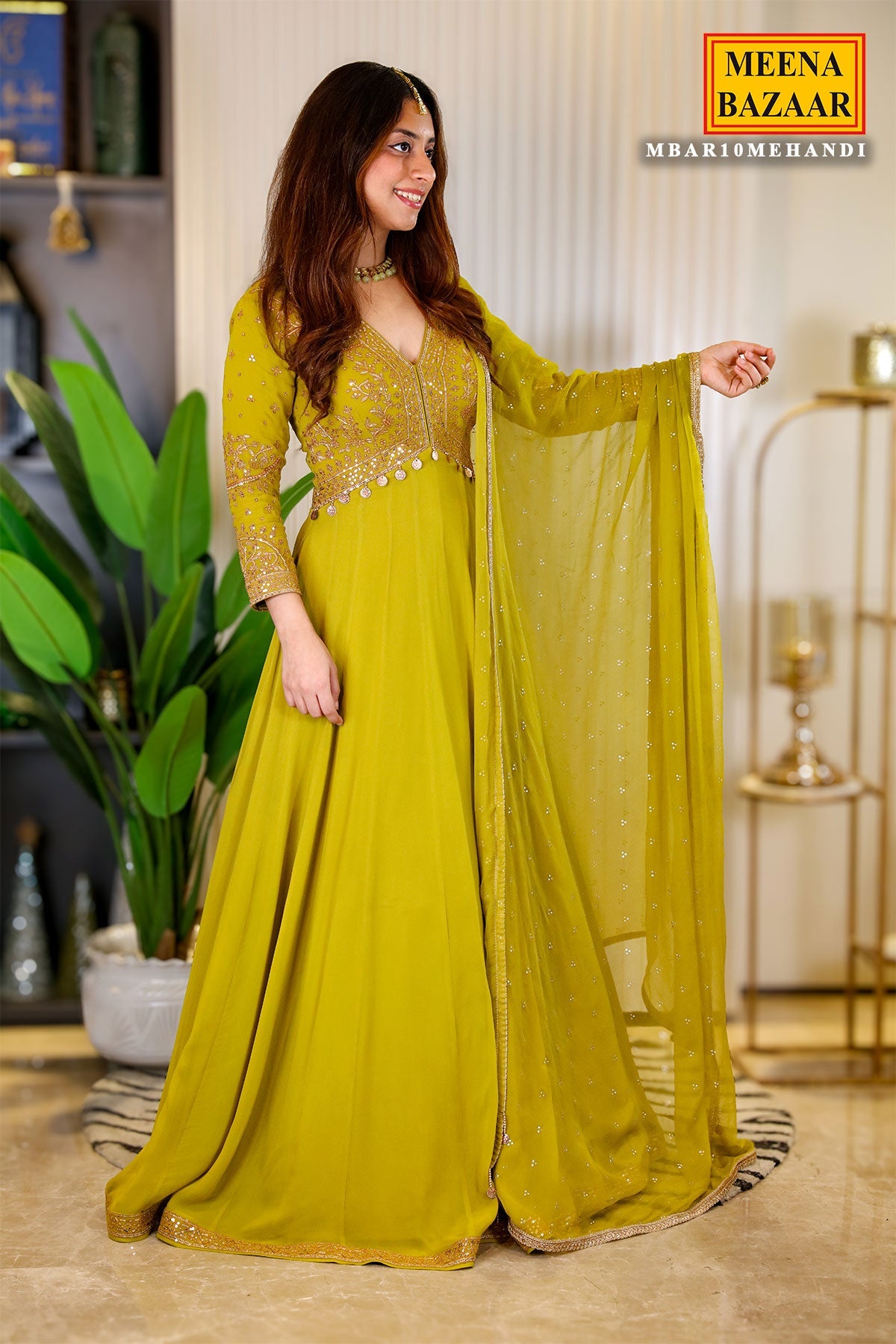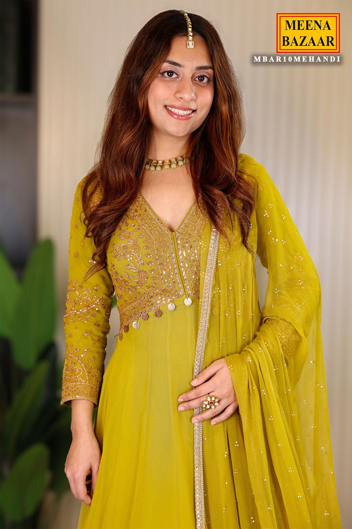 Planning to pick a perfect outfit for the upcoming Wedding or Mehandi, sangeet function? Look no further and get your hands on this Mehandi Georgette Thread, Zari Embroidered Suit with Sequins Work. It is crafted in georgette fabric with sequins work. It has a floor length with beautiful Thread & zari work and colourful weaves. The suit is accompanied by an enchanting matching embroidered dupatta. It's a perfect pick for all occasions- weddings, festivals, gatherings, etc. Style Tip: Pair it with different accessories to create a variety of looks.