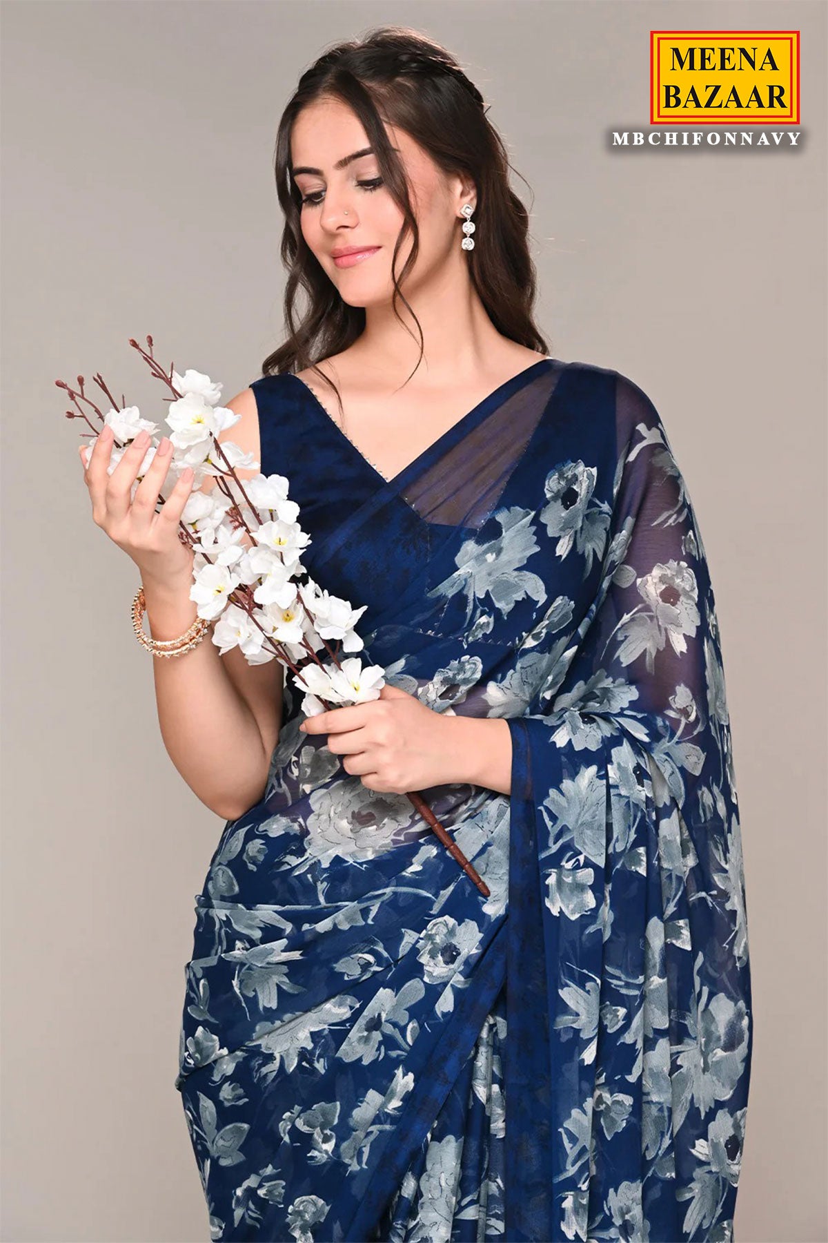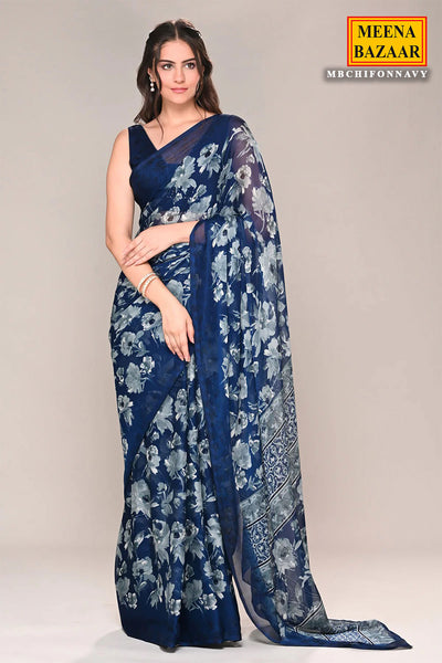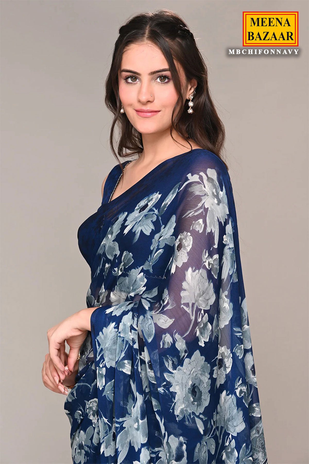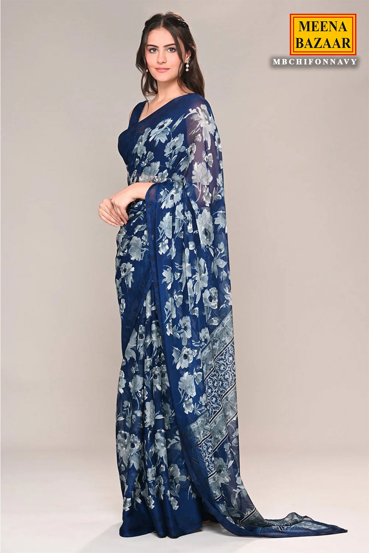A celebration of elegance and nature's beauty, Meena Bazaar brings to you this Navy Chiffon Floral Printed Saree. The lightweight chiffon fabric drapes gracefully, making you feel like a vision of femininity. The vibrant floral print adds a touch of whimsy and charm, infusing every step with a burst of color. Whether you're attending an intimate family function or a celebration out with friends, this saree is the epitome of grace. Stay assured that this Floral Printed Chiffon Saree is sure to turn heads and make you the centre of attention. Play around with how you want to get your blouse stitched and make a statement with this gorgeous drape for the upcoming party season. Note: Color may slightly differ from the actual item due to photographic lighting sources or the monitor's settings.