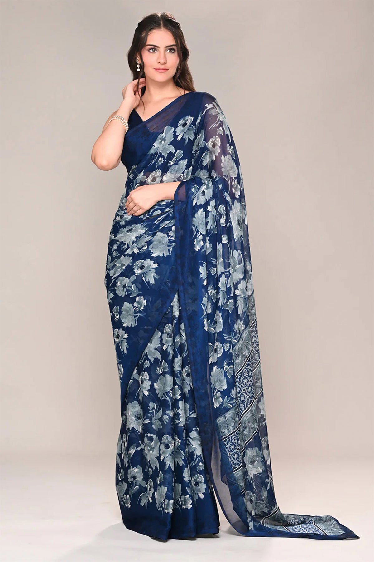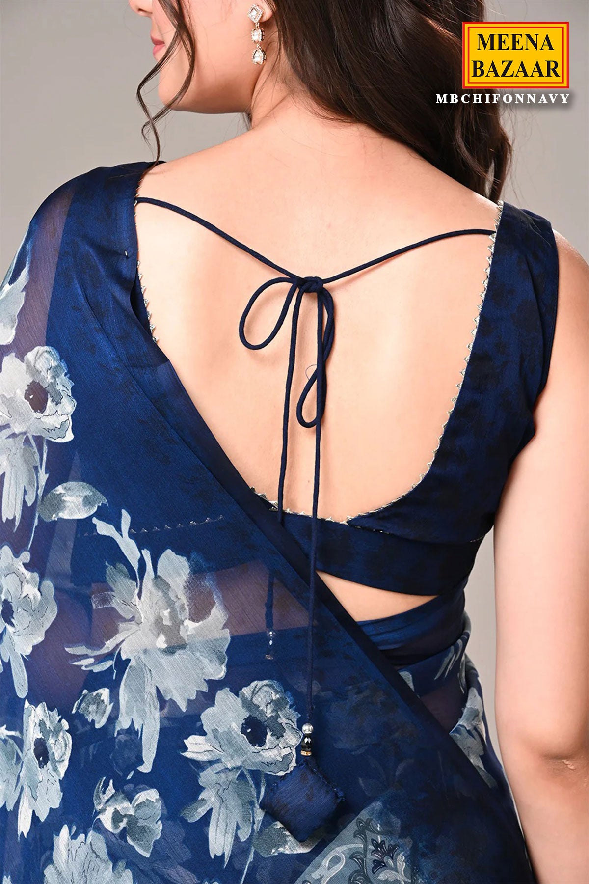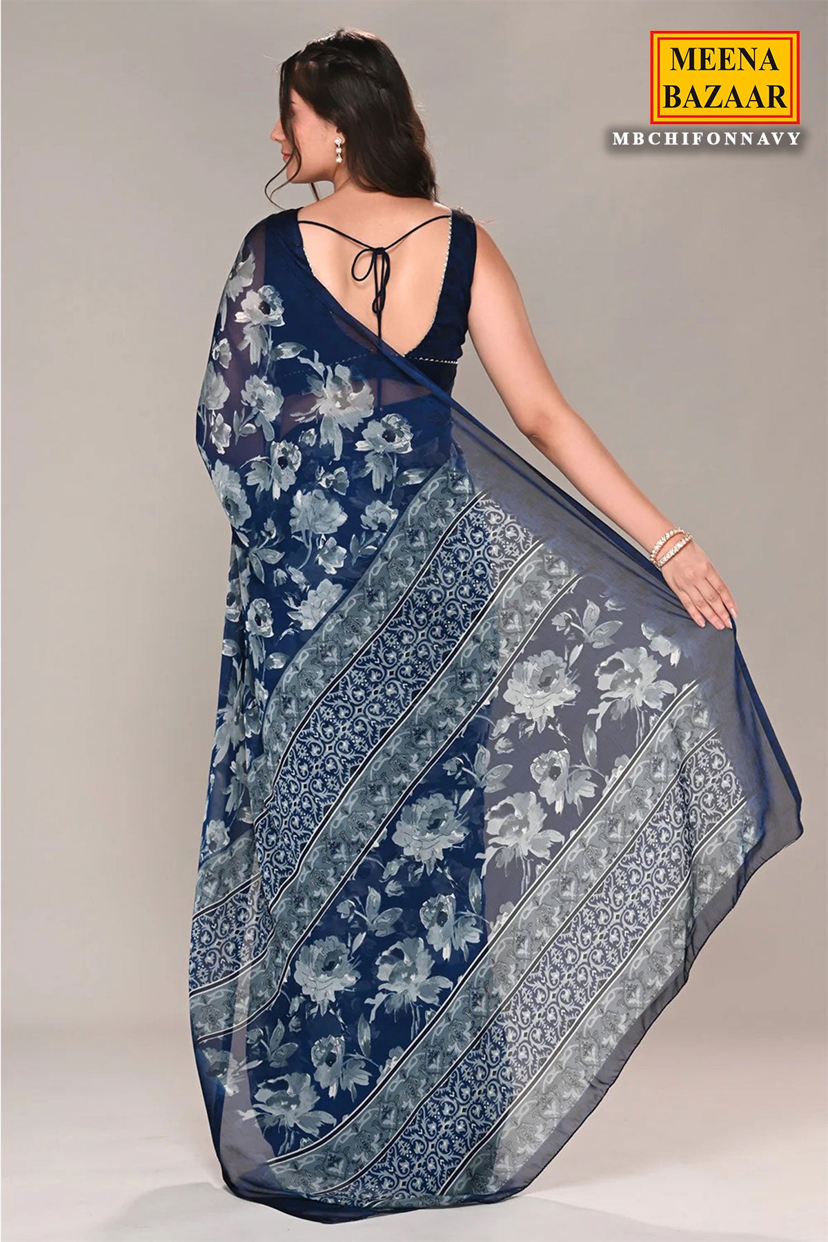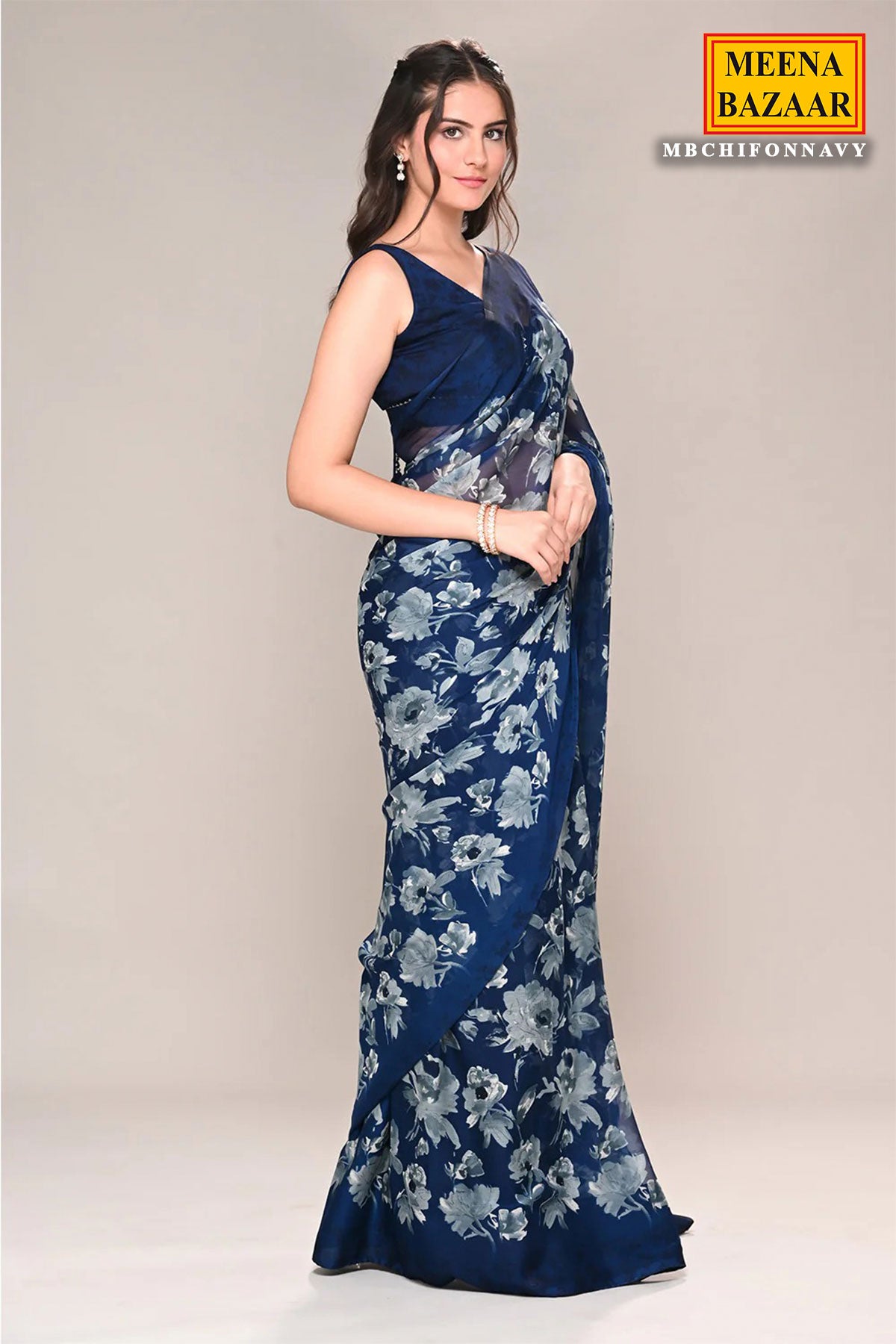 A celebration of elegance and nature's beauty, Meena Bazaar brings to you this Navy Chiffon Floral Printed Saree. The lightweight chiffon fabric drapes gracefully, making you feel like a vision of femininity. The vibrant floral print adds a touch of whimsy and charm, infusing every step with a burst of color. Whether you're attending an intimate family function or a celebration out with friends, this saree is the epitome of grace. Stay assured that this Floral Printed Chiffon Saree is sure to turn heads and make you the centre of attention. Play around with how you want to get your blouse stitched and make a statement with this gorgeous drape for the upcoming party season. Note: Color may slightly differ from the actual item due to photographic lighting sources or the monitor's settings.